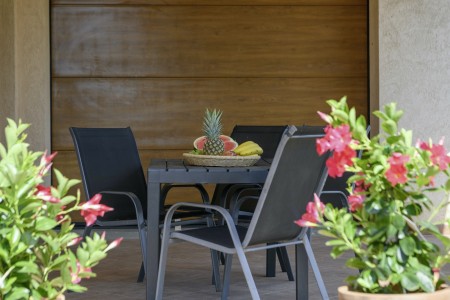 Studio za 2 osobe: ca. 30 m², u prizemlju, s vlastitim ulazom i terasom (ca. 20 m²). Dnevno-spavaći prostor s bračnim krevetom, klima uređajem i malom kuhinjom, te kupaonica (tuš/WC).