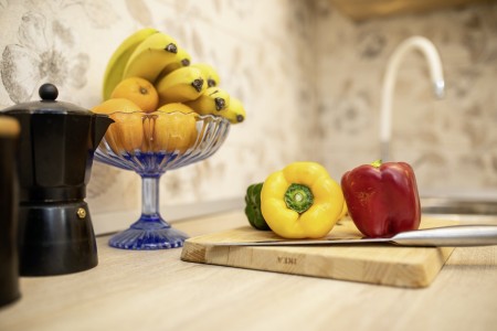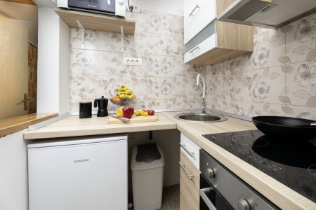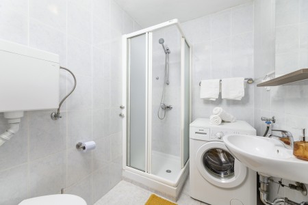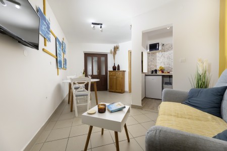 Apartman za 2 osobe: ca. 35 m², u prizemlju, nov i moderno uređen. Dnevni boravak s klima uređajem, kaučem, blagovaonskim stolom i vizualno odvojenom kuhinjom. Jedna spavaća soba s bračnim krevetom i kupaonica (tuš/WC). Natkrivena terasa s ležaljkama i stolićem.