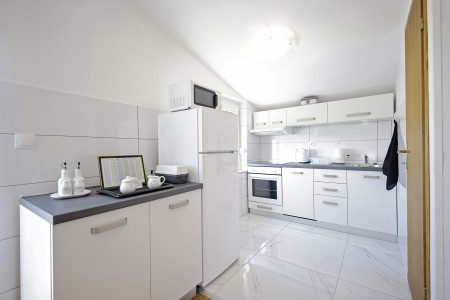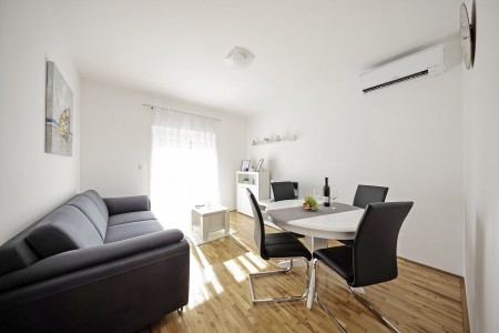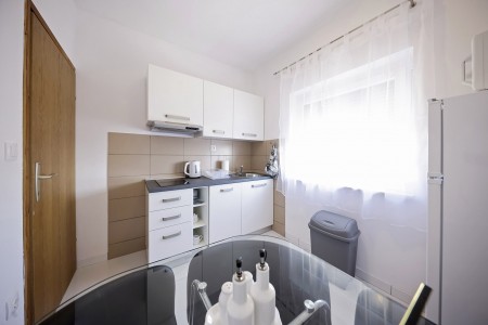 Apartman za 4 osobe AP1: ca. 95 m² na drugom katu. Klimatizirani dnevni boravak s blagovaonom gdje su kauč i TV. Kuhinja je odvojena. Jedna spavaća soba s bračnim krevetom, klimom i TV-om. Jedna spavaća soba s dva odvojena kreveta za po jednu osobu. Jedna kupaona (tuš/kutna kada), odvojeni WC. Balkon s pogledom na bazen i more.