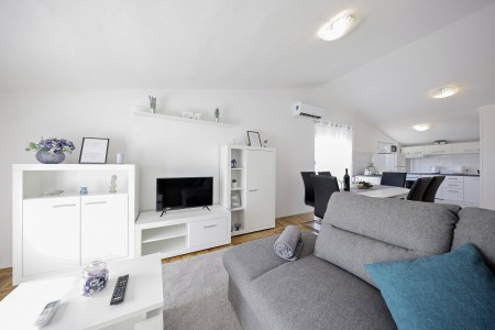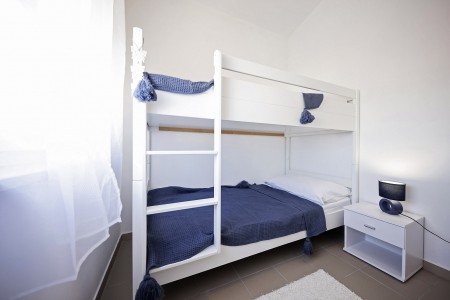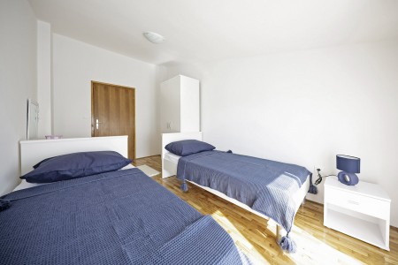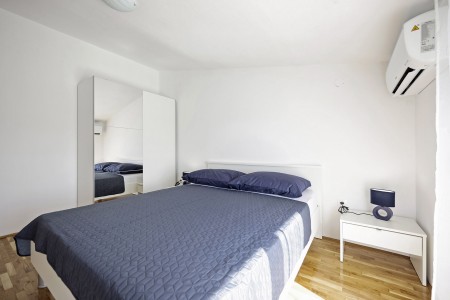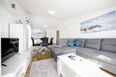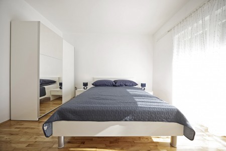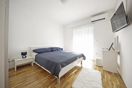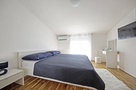 Apartman za 6 osoba AP2: ca. 110 m² na trećem katu. Klimatizirani dnevni boravak s blagovaonom, TV, udobni kauč i kompletno opremljena kuhinja. Jedna spavaća soba s bračnim krevetom, klimom i TV. Jedna spavaća soba s dva odvojena kreveta za po jednu osobu, jedna spavaća soba s krevetom na kat. Jedna kupaona (tuš/WC), jedna kupaona (kada i tuš) te odvojeni WC. Dva balkona s pogledom na bazen i more.