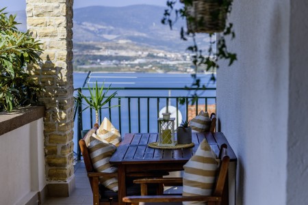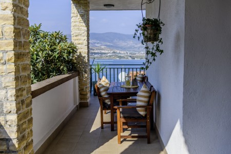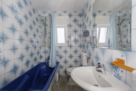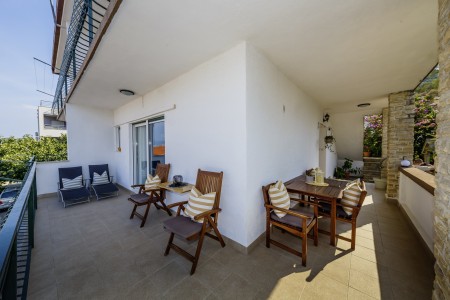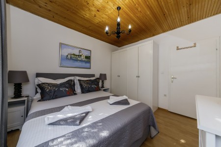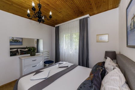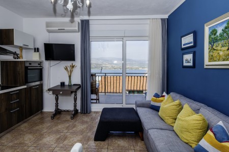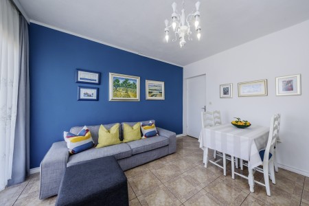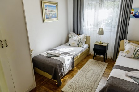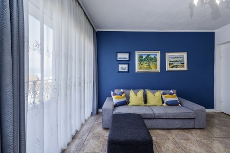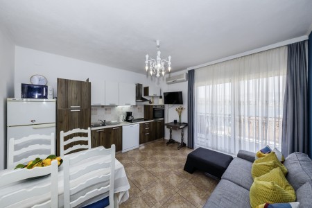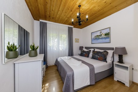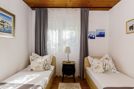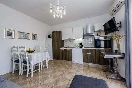 Apartman za 4 osobe: ca. 50 m², na prvom katu, s vlastitim ulazom. Dnevni boravak s klima uređajem, potpuno opremljenom kuhinjskom nišom, blagovaonskim stolom i udobnim kaučem, te izlazom na veliki balkon s pogledom na more. Jedna spavaća soba s bračnim krevetom, jedna spavaća soba s dva odvojena kreveta za po jednu osobu, kupaonica (kada/WC) s perilicom rublja, i zaseban WC.