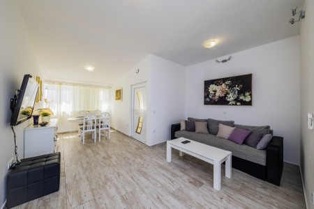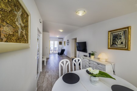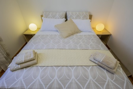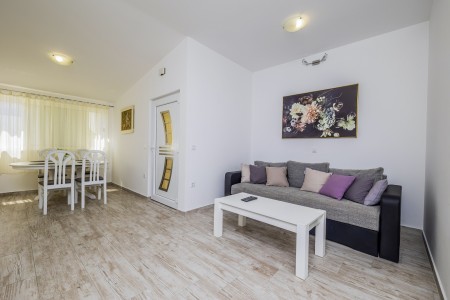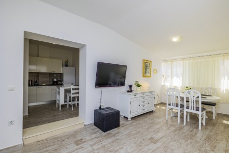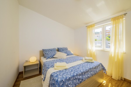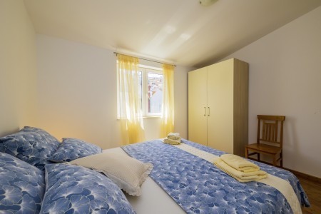 Apartman za 4-6 osoba: ca. 80 m² na trećem katu, s vlastitim ulazom. Dnevni boravak s klima uređajem, blagovaonskim stolom i kaučem na razvlačenje (160 x 200 cm), te izlazom na balkon s prekrasnim pogledom na more. Potpuno opremljena kuhinja. Dvije spavaće sobe s bračnim krevetima te kupaonica (tuš/WC). Kauč na razvlačenje u dnevnom boravku pogodan je isključivo za dvoje djece do 12 godina.