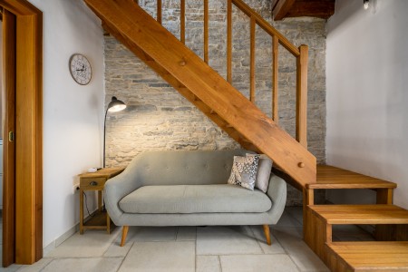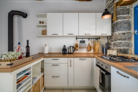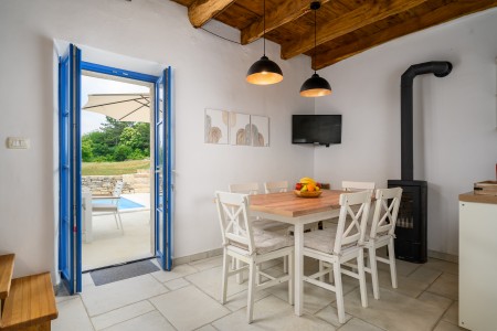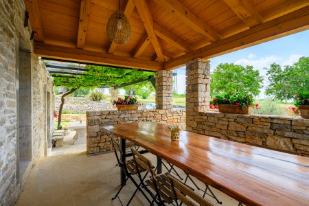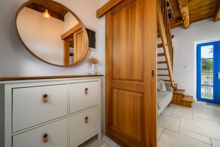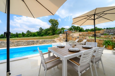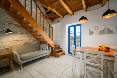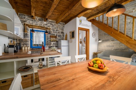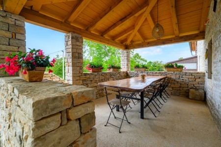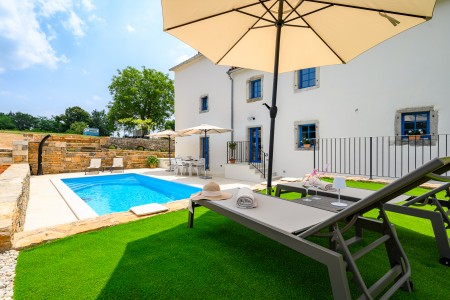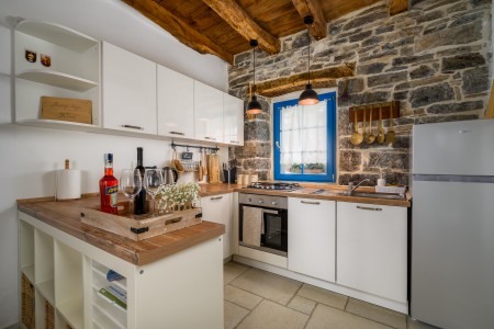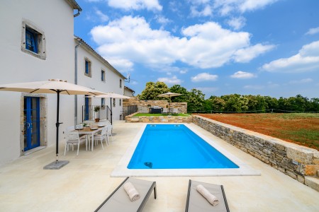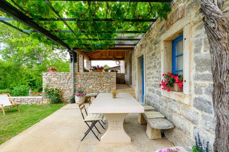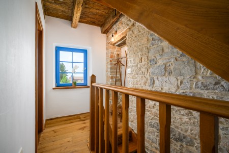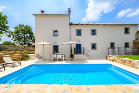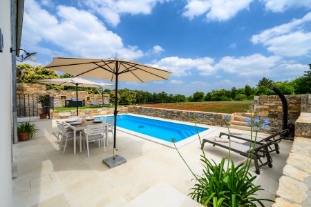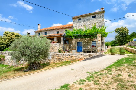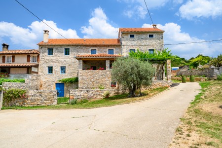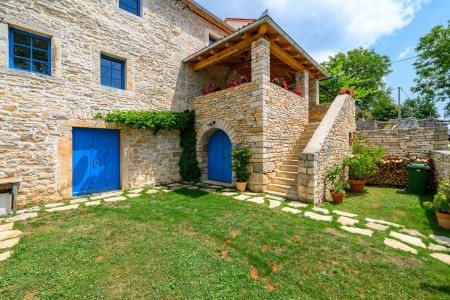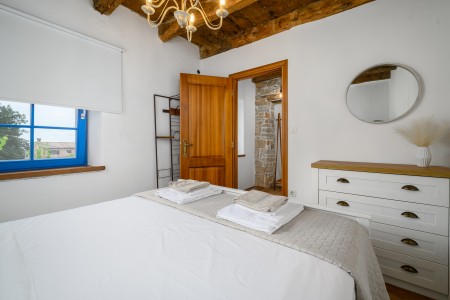 Ova šarmantna kamena kuća smještena je u malom i mirnom selu Klarići, u blizini slikovitog gradića Oprtlja. Na ulasku u Oprtalj dočekat će Vas elegantni redovi čempresa koji pokazuju put prema povijesnoj jezgri grada. Oprtalj, smješten na brežuljku s prekrasnim panoramskim pogledom na dolinu rijeke Mirne, impresionira svojom dobro očuvanom srednjovjekovnom arhitekturom, krivudavim kamenim ulicama i šarenim fasadama. Područje je poznato kao regija tartufa i cijenjeno je zbog svojih maslinika i vina, a također nudi i biciklističke staze koje prolaze kroz idilični krajolik. Mali gradić Oprtalj na jedinstven način spaja tradiciju i umjetničku atmosferu. Šarmantna dvorišta i arkade skrivaju galerije, antikvarijate i male butike koji pozivaju na otkrivanje i razgledavanje. Dok kuća s velikom parcelom i privatnim bazenom (3,7 x 8,5 m) s ležaljkama nudi oazu mira daleko od turističke gužve, živopisni obalni gradovi poput Umaga, Novigrada i Poreča, s brojnim plažama, udaljeni su samo 40-ak minuta vožnje automobilom. Restoran se nalazi otprilike 2 km od kuće, dok je najbliža trgovina na udaljenosti od oko 6 km. Sve ostale potrepštine za svakodnevne potrebe pronaći ćete u 20-ak km udaljenim Bujama.