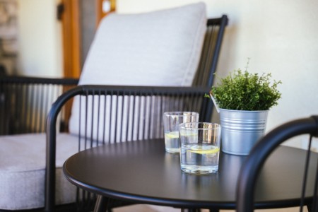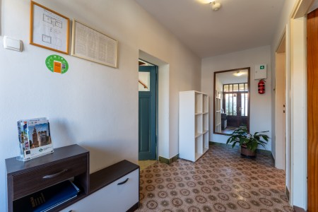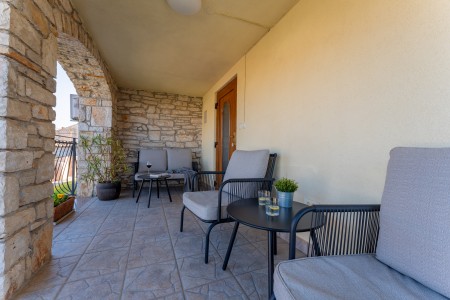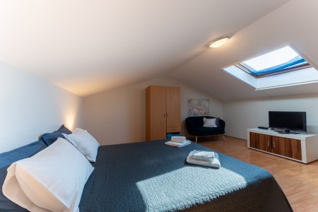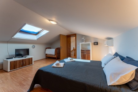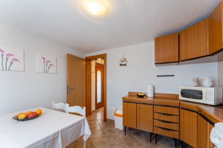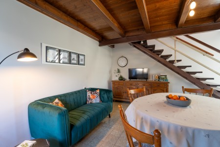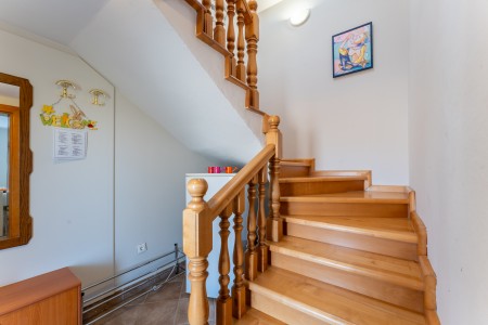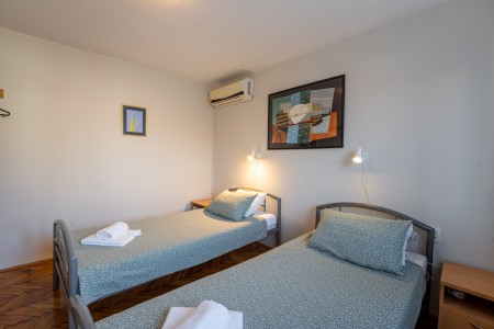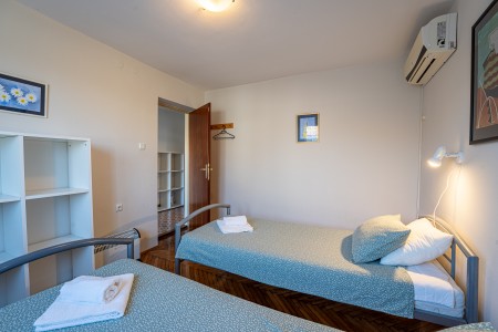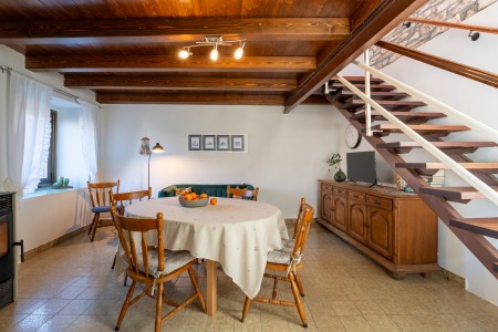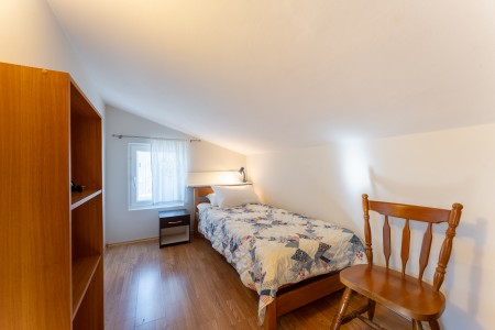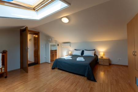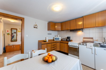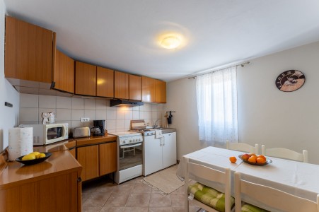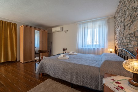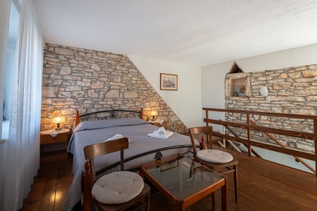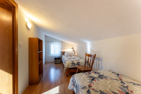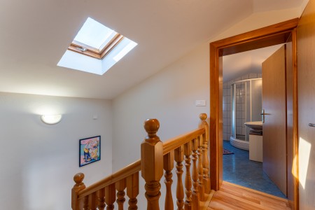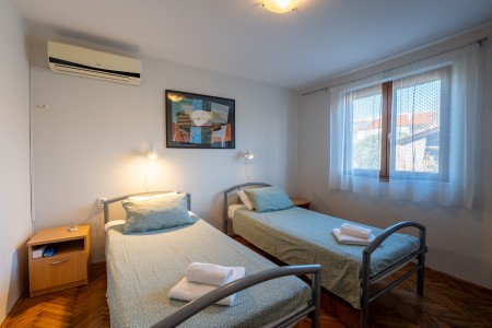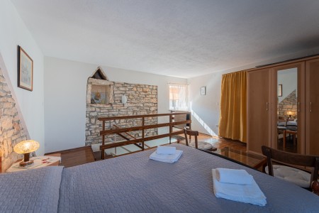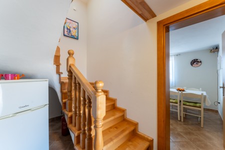 Kuća za 8 osoba: ukupno ca. 120 m², podijeljenih u dvije jedinice koje se iznajmljuju isključivo kao jedna cjelina. Prvi apartman (ca. 60 m²) proteže se kroz prizemlje i otvorenu galeriju. U prizemlju se nalazi kuhinja s blagovaonicom i dnevnim boravkom, kupaonica (kada/WC) te spavaća soba s dva odvojena kreveta za po jednu osobu i klima uređajem. Na otvorenoj galeriji nalazi se još jedna spavaća soba s bračnim krevetom. Vanjske stepenice vode do drugog apartmana (ca. 60 m²) koji se proteže kroz prvi i drugi kat. Ulaz vodi preko natkrivenog balkona u kuhinju s blagovaonicom i smještenih na prvome katu, dok se na drugom katu nalaze dvije spavaće sobe – jedna spavaća soba s bračnim krevetom, klima uređajem i TV-om, a druga s dva odvojena kreveta za po jednu osobu, te kupaonica (tuš/WC).