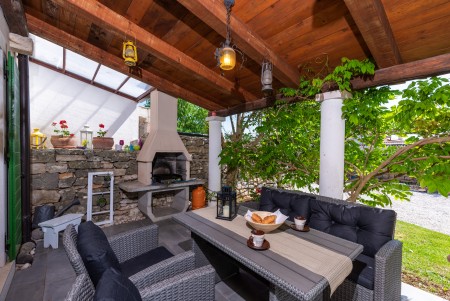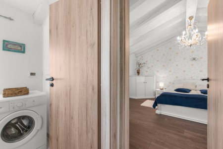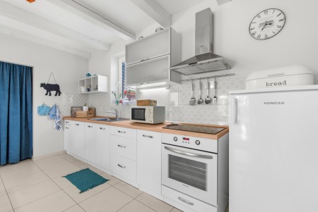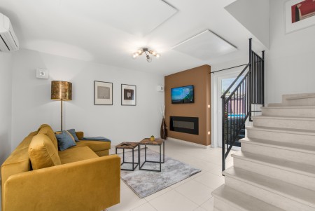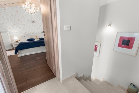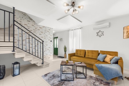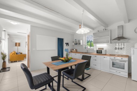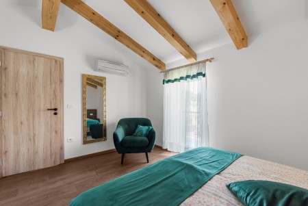 Kuća za 4 osobe: ca. 85 m², na dva kata. U prizemlju se nalazi potpuno opremljena kuhinja s blagovaonicom, klima-uređajem i izlazom na terasu opremljenu garniturom za sjedenje i roštiljem. Također, tu je i dnevni boravak s klima-uređajem i izlazom prema bazenu, kao i odvojeni WC. Na prvom katu nalaze se dvije spavaće sobe s bračnim krevetom, svaka opremljena klima-uređajem, te kupaonica (tuš/WC).