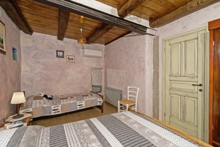 Kuća za 6 osoba: Kuća površine ca. 95 m² podijeljena na dva kata. U prizemlju klimatizirana dvokrevetna soba s dodatnim ležajem za jednu osobu, jedna manja soba s dva kreveta za jednu osobu i jedna kupaona (tuš/WC). Na prvi kat se možete popesti unutarnjim stepenicama ili vanjskim stubištem. Na prvom katu je klimatizirani dnevni boravak s kuhinjom, blagovaona i veliki otvoreni kamin. Tu je i još jedna dvokrevetna soba s dodatnim ležajem za jednu osobu i kupaona (tuš/WC). Na prvom katu je i jedna natkrivena terasa (ca. 6 m²), a pred kućom je jedna velika terasa (ca. 42 m²) sa sjedećom garniturom, stolom i roštiljem.