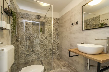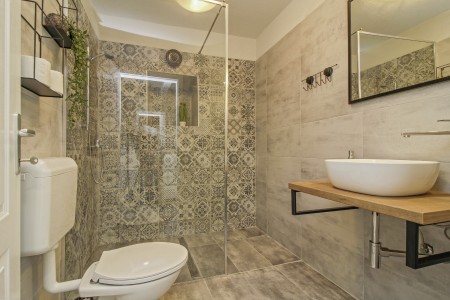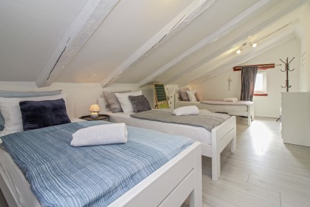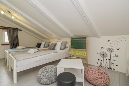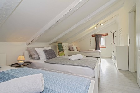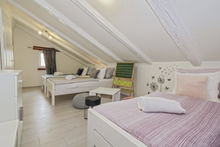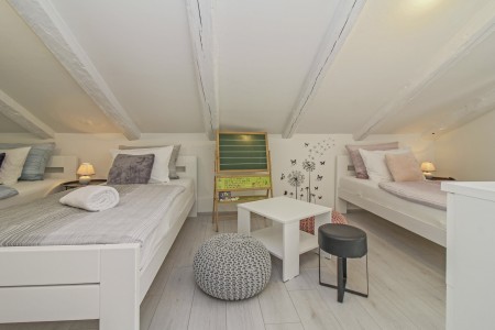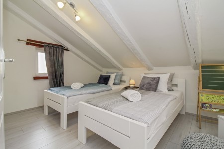 kupaone (tuš/WC). Na prvom katu su dvije spavaće sobe – jedna s bračnim