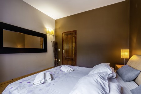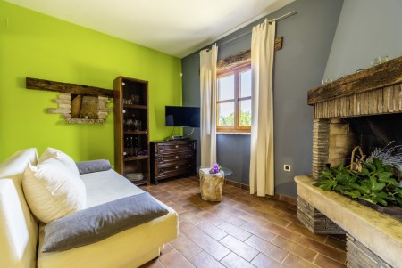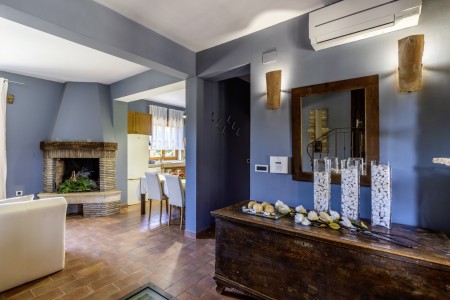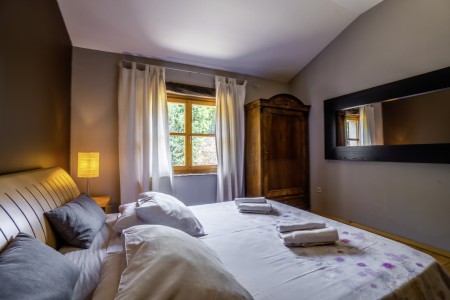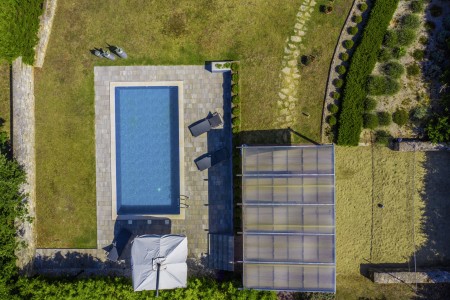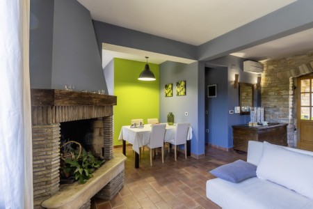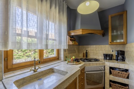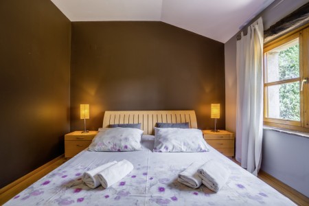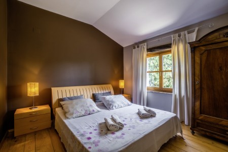 Kuća za 4-6 osoba: Kuća površine ca. 120 m² podijeljena na dva kata. U prizemlju (ca. 80 m²) dnevni boravak s otvorenim kaminom, kuhinja i mala blagovaona, jedna dvokrevetna soba i kupaona (kada/WC). Na prvom katu dnevni boravak u kojem je kauč na razvlačenje za dvije osobe. Kroz taj dnevni boravak se dolazi u još jednu spavaću dvokrevetnu sobu s kupaonom (tuš/WC). Kroz obje sobe se izlazi na terasu i u dvorište gdje su bazen (8 x 4 m) i natkrivena terasa sa sjedećom garniturom. Sve prostorije su klimatizirane.