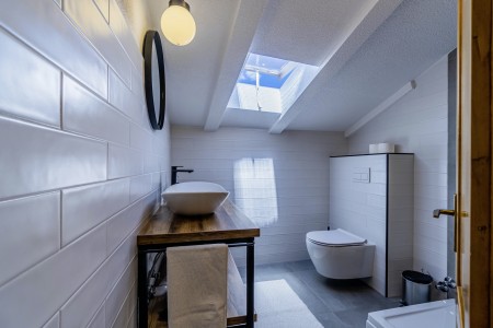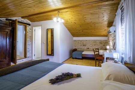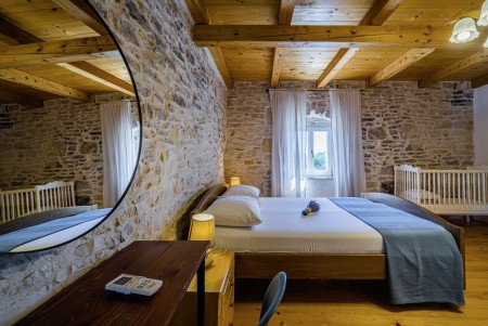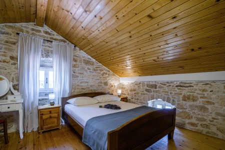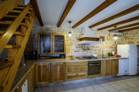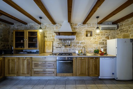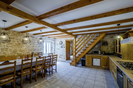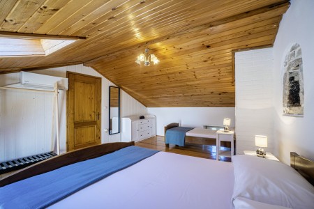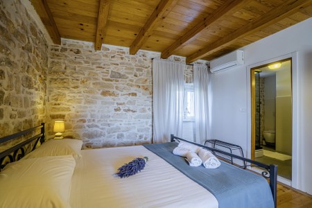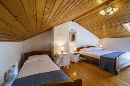Kuća za 10-15 osoba: Kuća površine ca. 235 m² podijeljena na tri kata. U prizemlju kuhinja s blagovaonom, dnevni boravak s kaminom, kupaona (tuš/WC) i spremište. Na prvom katu tri spavaće sobe i dvije kupaone (tuš/WC). U potkrovlju dvije spavaće sobe i dvije kupaone (tuš/WC). Tri sobe imaju bračni krevet i krevet za jednu osobu, jedna soba ima bračni krevet, a jedna soba ima jedan bračni krevet i dva kreveta za jednu osobu. Sve prostorije su klimatizirane.