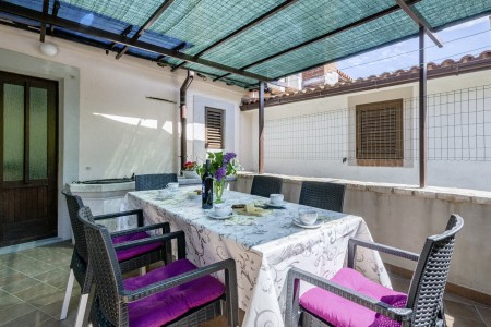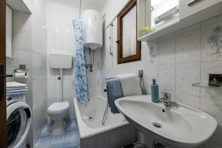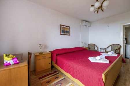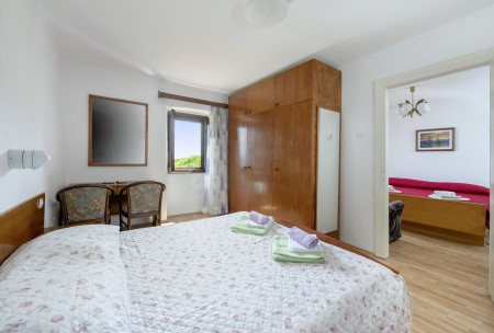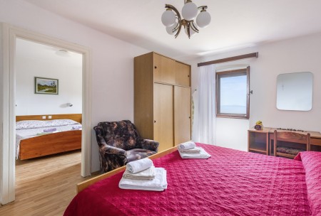 Kuća za 6 osoba: ca. 110 m² stambene površine na prvom katu, jednostavno uređena. Potpuno opremljena kuhinja, dnevni boravak s klima uređajem i blagovaonicom, kupaonica (tuš/WC), spavaća soba s bračnim krevetom, spavaća soba s bračnim krevetom i klima uređajem, iz koje se ulazi u još jednu spavaću sobu s bračnim krevetom. Osim toga, terasa sa stolom, stolicama i mogućnošću roštiljanja.