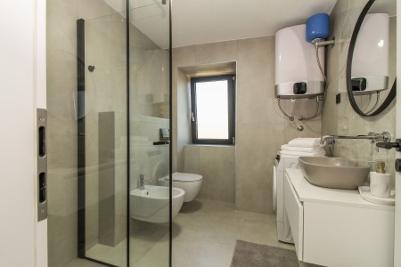 Kuća za 2-3 osobe: Prizemnica površine ca. 44 m². Jedna dvokrevetna spavaća soba u kojoj je i kauč na razvlačenje za jednu osobu i klima uređaj. Dnevni boravak s kuhinjom i blagovaonom, kauč, i kupaona (tuš/WC). U dvorištu natkrivena terasa sa stolom i klupama. Sa stražnje strane kuće je velika otvorena terasa (ca. 25 m²) na kojoj su roštilj i ležaljke, a s ove strane se proteže i prekrasan pogled na krajolik.