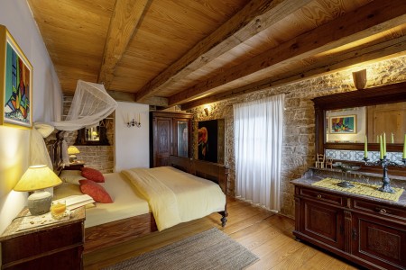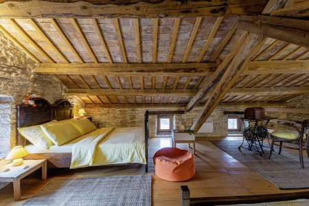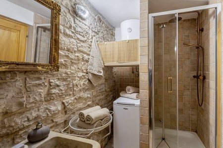 Kuća za 5-6 osoba: Kuća površine ca. 132 m² podijeljena na tri kata. U prizemlju kuhinja s otokom za kuhanje i barskim stolicama, jedna kupaona (tuš/WC) i jedan veliki dnevni boravak s kaučem na razvlačenje, platnom (170 x 170 cm), projektorom s tv signalom i izlazom u dvorište. Na prvom katu jedna spavaća soba s bračnim krevetom i jedna kupaona (kada/WC). U prostranom klimatiziranom potkrovlju je jedan bračni krevet i jedan kreveta za jednu osobu. Izvan suhozida je livada koja samo Vama stoji na raspolaganju. Tu je i jedna terasa u kojoj je hladovina i na kojoj možete uživati u miru. U staroj kamenoj peći možete peći kruh, pizzu ili krumpire.