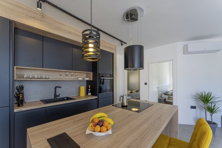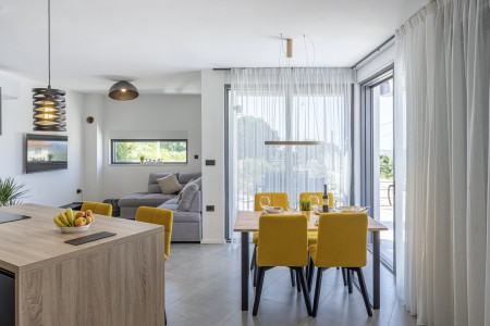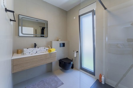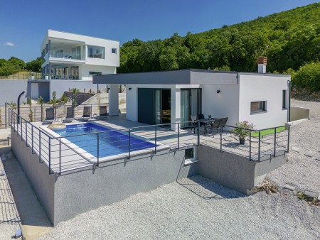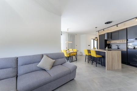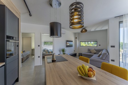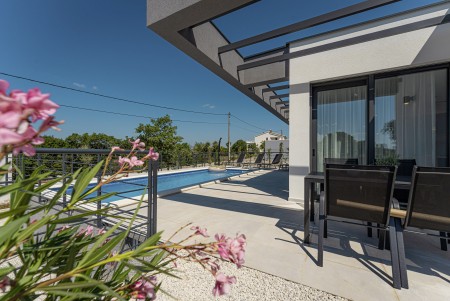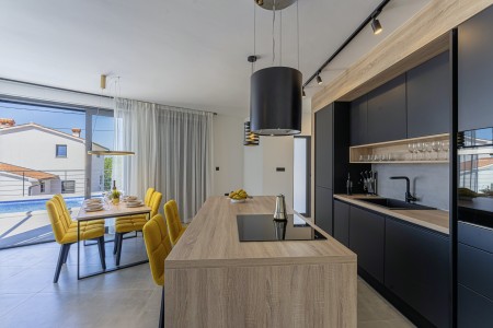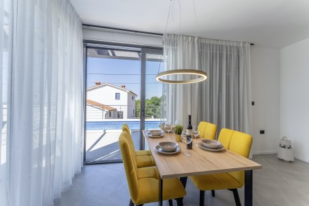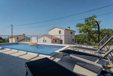 Nedavno dovršena kuća smještena je u Trgetu te je udaljena samo 1,5 km od mora. U Trgetu možete pronaći sve što Vam je potrebno za svakodnevne potrebe, dok je najbliži veći grad Labin, sa svojom atraktivnom starogradskom jezgrom, brojnim trgovinama, restoranima i barovima, udaljen samo 8 km i lako dostupan automobilom. Osim modernog interijera, očekuje Vas uređeni vanjski prostor s privatnim bazenom (3 x 8 m), sunčanom terasom i roštiljem.