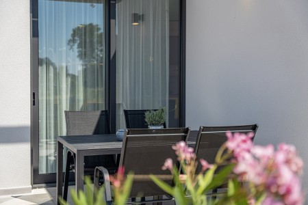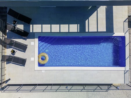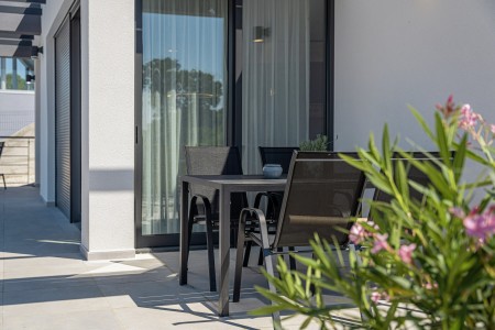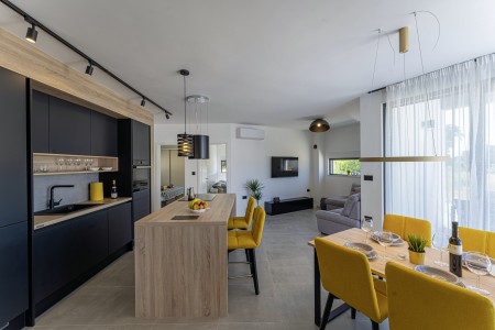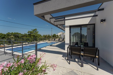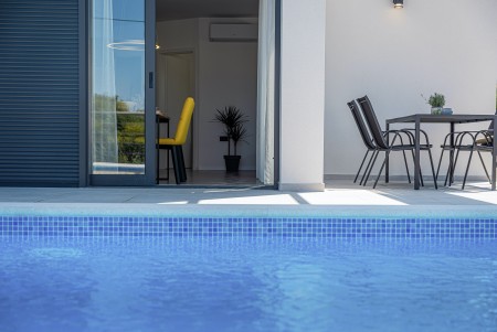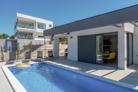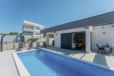Prizemna dizajnerska kuća s 2 spavaće sobe, terasom i privatnim bazenom, samo 1,5 km do mora