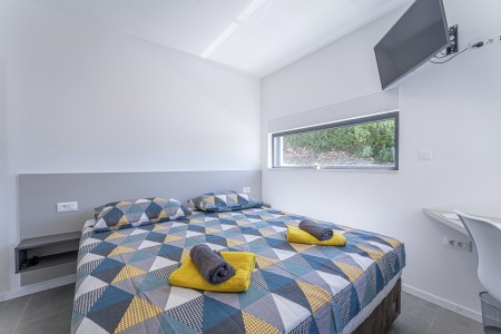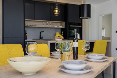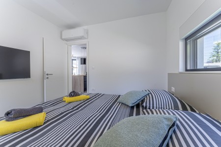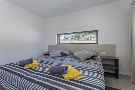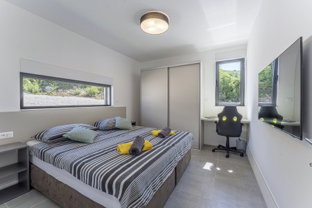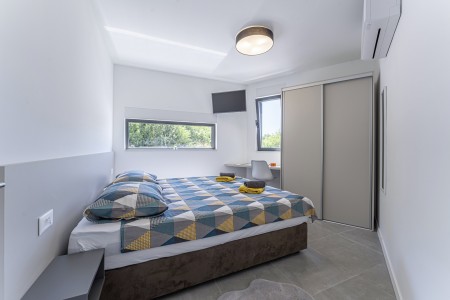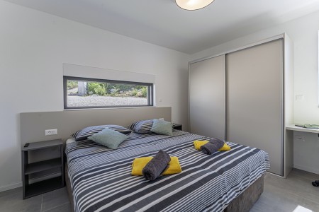 Kuća za 4-5 osoba: ca. 74 m², prizemnica, moderno uređena. Kuća nudi open-space dnevni boravak s klima uređajem, kaučem na razvlačenje (90 x 200 cm), potpuno opremljenom kuhinjom i blagovaonicom te izlazom na terasu uz bazen. Tu su i dvije spavaće sobe s bračnim krevetom, klima uređajem i TV-om, kao i kupaonica (tuš/WC). Osim toga, tu je i zaseban WC.