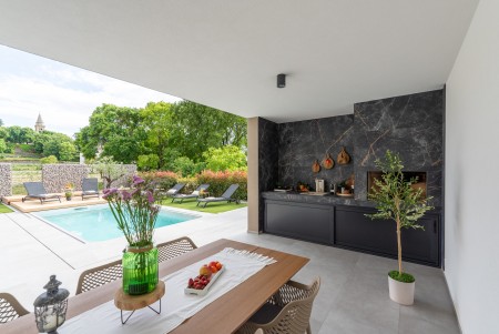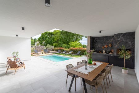 Samostojeća kuća nalazi se u Žminju, mjestu u središnjoj Istri. Villa nudi tri spavaće sobe i može smjestiti do šest osoba. U ograđenom dvorištu na raspolaganju Vam stoje privatni bazen (6 x 2,5 m) sa sunčanom terasom, ležaljkama, suncobranom i vanjskim tušem, kao i natkrivena terasa s garniturom za sjedenje, ljetnom kuhinjom (sudoper, indukcijska ploča, mali hladnjak) te ugrađenim roštiljem. U okolici gosti mogu pronaći mnoge zanimljive atrakcije. Zahvaljujući povoljnom položaju u unutrašnjosti Istre, svaki dan pruža priliku za istraživanje u drugom smjeru – od šarmantnih, živopisnih mjesta na obali do skrivenih ljepota u unutrašnjosti. Trgovina se nalazi na otprilike 100 metara udaljenosti, dok je restoran udaljen oko 150 metara. U Žminju su Vam na raspolaganju trgovine za svakodnevnu kupovinu, kao i nekoliko kafića i restorana. Brojne plaže u okolici Rovinja udaljene su otprilike 25 minuta vožnje automobilom.