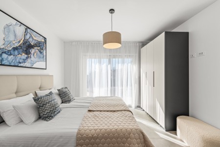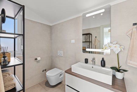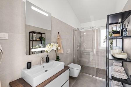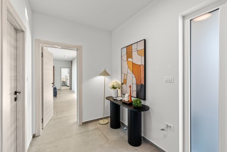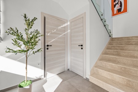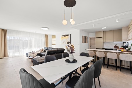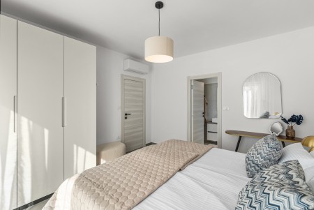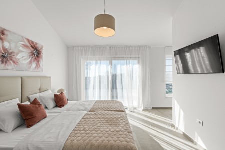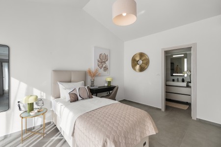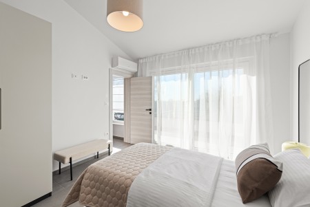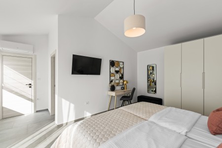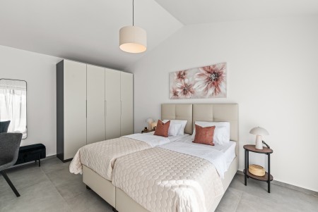 Kuća za 6 osoba: ca. 145 m², raspoređenih na dvije etaže. Moderno uređena, villa u prizemlju nudi open-space dnevno-blagovaonski prostor s klima uređajem, potpuno opremljenom kuhinjom i izlazom na natkrivenu terasu s pogledom na bazen. Nadalje, u prizemlju se nalazi jedna spavaća soba s bračnim krevetom i klima uređajem, jedna kupaonica (tuš/WC) te odvojeni WC. Na prvome katu se nalaze dvije spavaće sobe, svaka s dva odvojena kreveta za po jednu osobu, klima uređajem i vlastitom kupaonicom (tuš/WC). Obje sobe imaju izlaz na zajednički balkon. Jedna od spavaćih soba dodatno je opremljena TV-om.