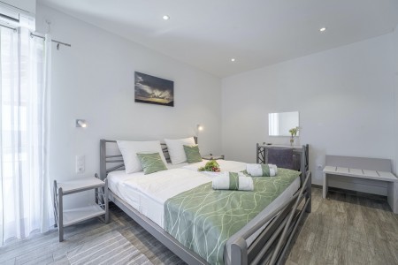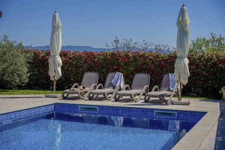 Kuća za 6 osoba: ca. 150 m² prizemnica, moderno i udobno uređena, nudi prostrani, svijetli dnevni boravak/blagovaonicu s klima uređajem, udobnim kaučem, potpuno opremljenom kuhinjom i izlazom na natkrivenu terasu uz bazen. Također, dostupan je i zaseban WC. Nadalje, villa ima jednu spavaću sobu s dva spojena kreveta za jednu osobu i dvije spavaće sobe s bračnim krevetima. Svaka spavaća soba opremljena je klimom i TV-om, i ima vlastitu kupaonicu (tuš/WC).