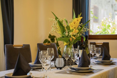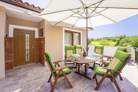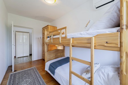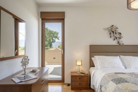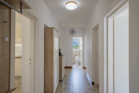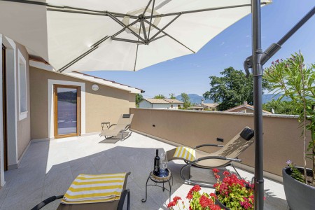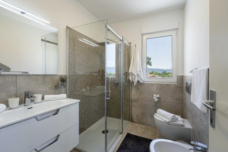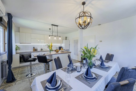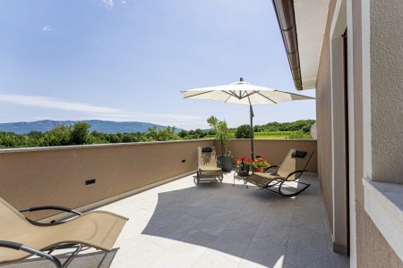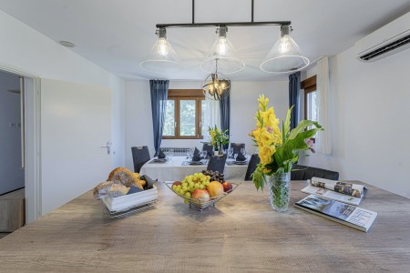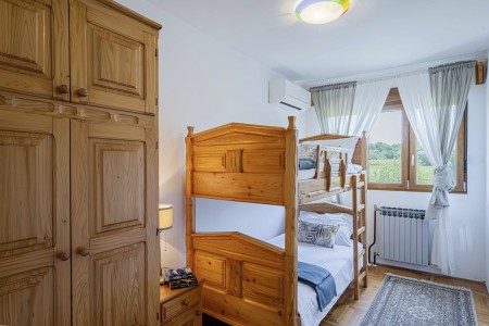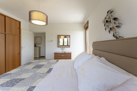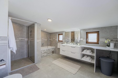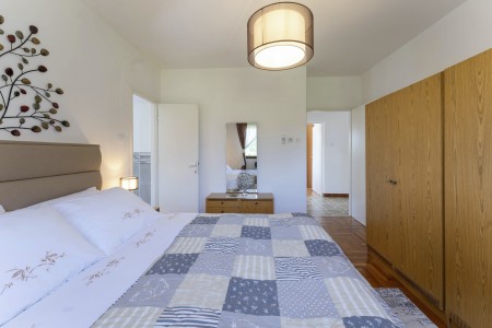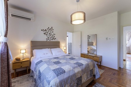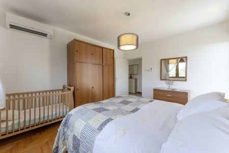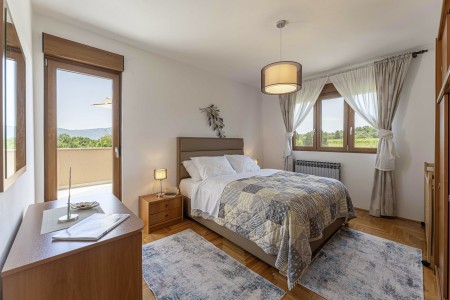 Kuća za 6-7 osoba: ca. 143 m² na prvom katu. Kuća nudi modernu, potpuno opremljenu kuhinju s kuhinjskim otokom, klima uređajem i blagovaonicom, te odvojen dnevni boravak s kaučem na razvlačenje (120 x 190 cm) za jednu osobu, klima uređajem i izlazom na veliku terasu sa sjedećom garniturom. Također, tu je spavaća soba s krevetom na kat i klima uređajem, kupaonica (tuš/WC), spavaća soba s bračnim krevetom, klima uređajem i terasom s predivnim pogledom na krajolik, te spavaća soba s bračnim krevetom, klima uređajem i prostranom kupaonicom s dva umivaonika (kada/tuš/WC). Prizemlje kuće se ne iznajmljuje niti u njemu netko živi.