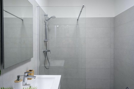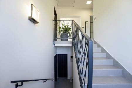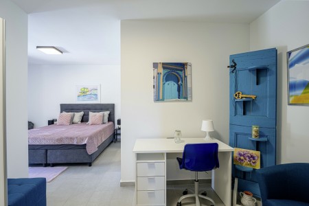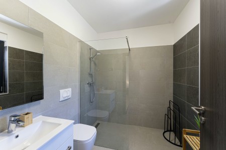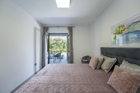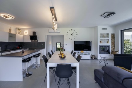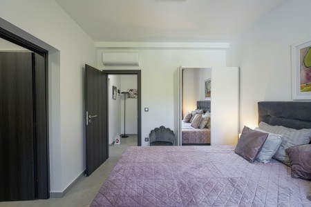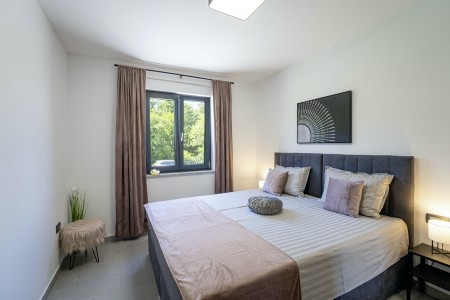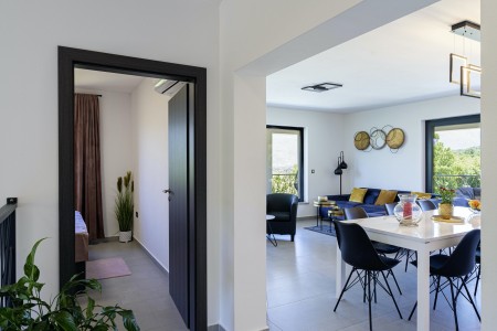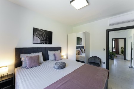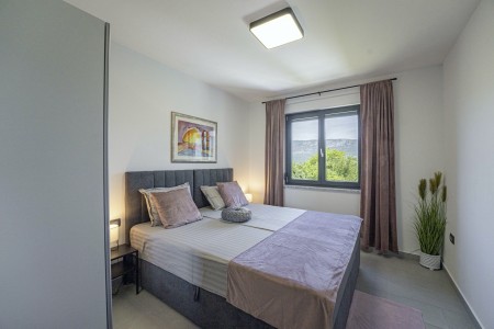 Kuća za 8 osoba: ca. 150 m², na dvije etaže, moderno i kvalitetno uređena. U prizemlju se nalaze dvije klimatizirane spavaće sobe s bračnim krevetima i dvije kupaonice (tuš/WC). Obje spavaće sobe imaju izlaz na terasu uz bazen. Na prvom katu nalazi se prostrani dnevni boravak/blagovaonica s udobnim kaučem, kaminom, klima uređajem i potpuno opremljenom kuhinjom, kao i velika natkrivena terasa sa sjedećom garniturom i panoramskim pogledom. Na prvom katu također se nalaze dvije spavaće sobe s bračnim krevetima i klima uređajem, te dvije kupaonice (tuš/WC).