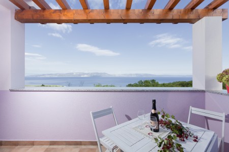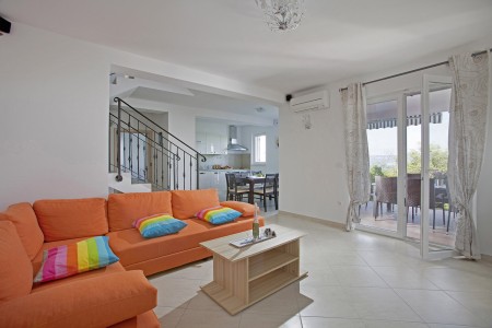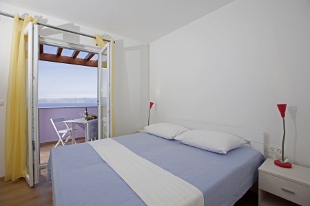 Kuća za 8 osoba: Kuća površine ca. 135 m² podijeljena na dva kata. Kako se kuća nalazi na terasastom zemljištu, glavni ulaz je na prvom katu, a kroz kuću se stepeništem silazi u prizemlje gdje se nalazi kompletno opremljena kuhinja s blagovaonom i dnevnim boravkom, jedna spavaća soba s dva kreveta za jednu osobu i kupaona (kada/WC) kao i natkrivena terasa (20 m²). Osim toga, tu je i ostava i zaseban WC. Na prvom katu nalaze se tri spavaće sobe, svaka sa svojom kupaonom (tuš/WC). Dvije sobe imaju bračne krevete, a jedna soba ima dva kreveta za jednu osobu. Na prvom katu se nalaze i dva balkona s pogledom na more. Sve sobe su klimatizirane.