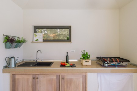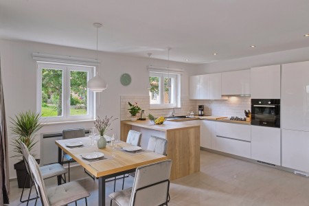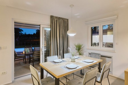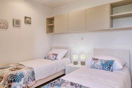 Kuća za 6 osoba: Kuća površine ca. 120 m² podijeljena na dva kata. U prizemlju je otvoreni klimatizirani prostor u kojem je kuhinja, blagovaona i dnevni boravak. Odavde se izlazi na veliku natkrivenu terasu s pogledom na bazen. Osim toga, tu je i jedna kupaona (kada/WC). Samo dvije stepenice više ide se u drugi dio gdje su smještene tri spavaće sobe. Dok dvije spavaće sobe imaju bračni krevet i vlastitu kupaonu (tuš/wc), u jednoj sobi su dva odvojena kreveta za po jednu osobu. Sve spavaće sobe su klimatizirane i imaju SAT-TV.