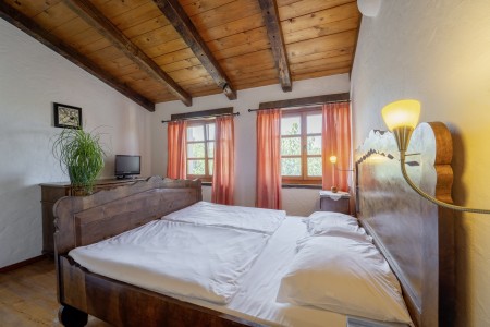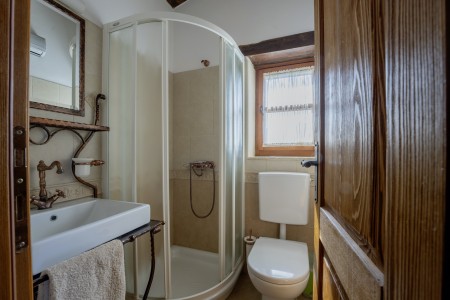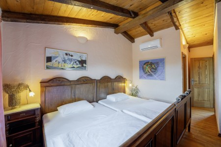 Kuća za 6 osoba: ca. 140 m², na dvije etaže, komforno uređena. U prizemlju se nalazi potpuno opremljena kuhinja s blagovaonicom i klima uređajem, dnevni boravak s udobnom garniturom, kaminom i klima uređajem, te dodatna blagovaonica koja se može otvoriti prema bazenu. Prizemlje također nudi spavaću sobu s bračnim krevetom, klima uređajem, TV-om i kupaonicom (tuš/WC), kao i zaseban WC. Na prvom katu nalaze se spavaća soba s bračnim krevetom i spavaća soba s dva spojena kreveta za jednu osobu. Obje spavaće sobe opremljene su klima uređajem i TV-om te svaka ima vlastitu kupaonicu (tuš/WC).