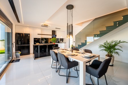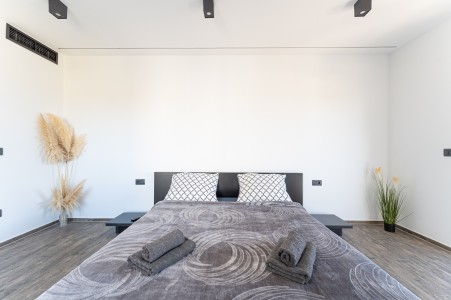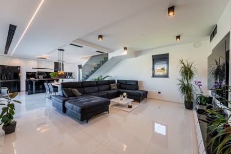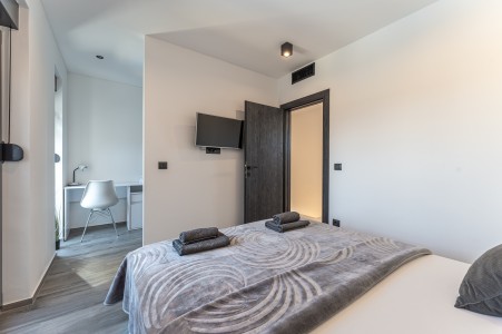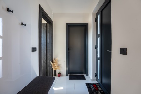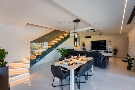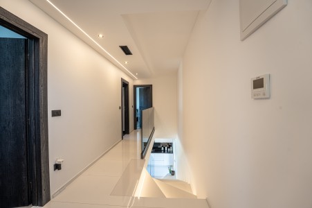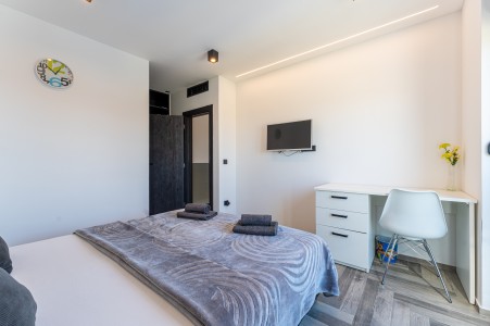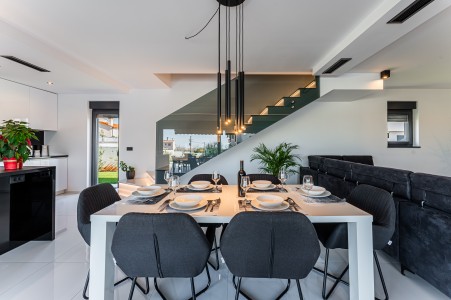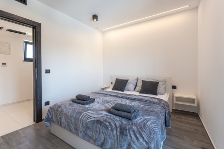 Kuća za 6 osoba: ca. 185 m², na dvije etaže. U prizemlju se nalazi prostrani open-space dnevno-blagovaonski prostor s kompletno opremljenom kuhinjom i klima uređajem. Iz ovog prostora izlazi se direktno na terasu opremljenu garniturom za sjedenje. Također, u prizemlju se nalazi i kupaonica (tuš/WC). Na prvom katu nalaze se tri spavaće sobe, svaka s bračnim krevetom, TV-om i klima uređajem. Jedna od spavaćih soba ima i privatni balkon s pogledom na more u daljini. Uz to, na ovom katu se nalaze i dvije kupaonice (tuš/WC).
