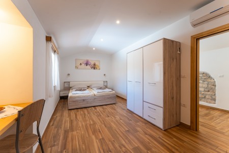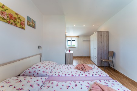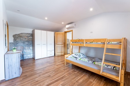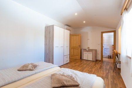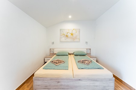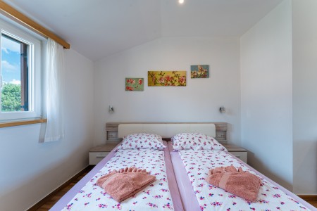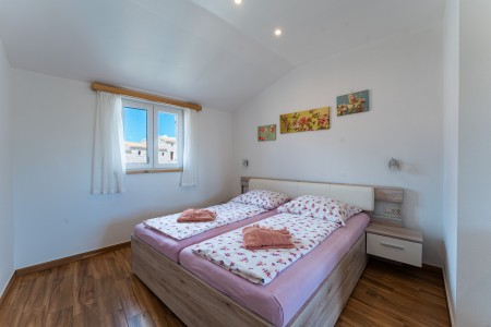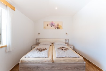 Kuća za 6-7 osoba: Kuća površine ca. 150 m², podijeljena na dva kata. U prizemlju klimatizirani veliki, otvoreni prostor u kojem je kompletno opremljena kuhinja, blagovaona i dnevni boravak. Tu su i jedno spremište i kupaona (tuš/WC). Na prvom katu su tri klimatizirane spavaće sobe i svaka ima svoju kupaonu (tuš/WC). Dvije spavaće sobe imaju bračni krevet, a u najvećoj spavaćoj sobi je jedan dupli krevet s krevetom na kat (gore: 90 x 200 cm – pogodno samo za jedno dijete do 11,99 godina, dolje: 120 x 200 cm – pogodno za dvoje djece do 11,99 godina ili maksimalno jednu odraslu osobu).