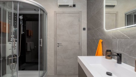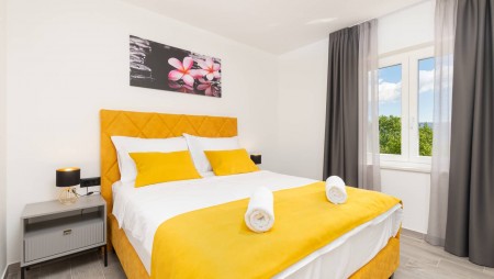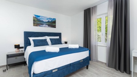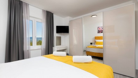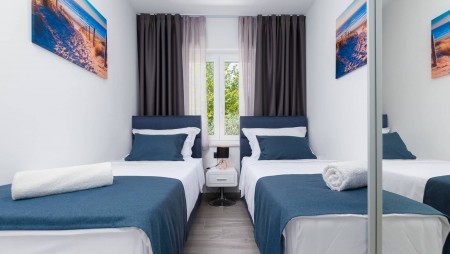 Kuća za 6-8 osoba: ca. 125 m², na prvom katu. Sastoji se od open-space prostora, u kojem su kuhinja, blagovaonica i dnevni boravak s kaučem na razvlačenje (160 x 190 cm), klima uređajem i izlazom na balkon. Osim toga, tu su i dvije spavaće sobe, svaka s bračnim krevetom, klima uređajem i TV-om. Jedna od spavaćih soba ima izlaz na balkon. Treća spavaća soba opremljena je s dva odvojena kreveta, klima uređajem i TV-om. Tu je također kupaonica (tuš/WC), te zaseban WC. Prizemlje kuće se ne iznajmljuje niti u njemu netko živi.