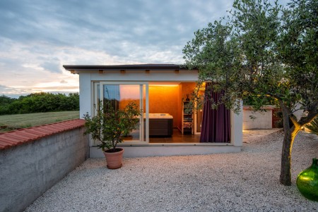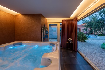 Ova samostojeća villa smještena je na privatnoj parceli površine 2.000 m², nedaleko od sela Radetići. Interijer kuće ukusno je uređen te s četiri spavaće sobe i dvije kupaonice nudi visoku razinu komfora. Pažljivo osmišljena i prilagođena visokim standardima, kuća je opremljena svim sadržajima potrebnim za opuštajući boravak, čineći je idealnim izborom za obitelji i parove koji traže vlastiti kutak mira. Uz privatni bazen (6 x 4 m) s terasom za sunčanje, ležaljkama i suncobranima, gostima je na raspolaganju prostrani natkriveni vanjski prostor osmišljen za opuštanje i rekreaciju. Ovaj prostor uključuje ljetnu kuhinju opremljenu s roštiljem, sudoperom, hladnjakom i štednjakom, blagovaonski stol sa stolicama za ugodna druženja na otvorenom te elegantan lounge kutak s udobnom sjedećom garniturom. Osim toga, tu je i kutak sa spravama za fitness, savršen za održavanje aktivnosti tijekom boravka. Poseban dodatni sadržaj pruža zasebna wellnes oaza opremljena jacuzzijem, a smještena u dvorištu. Zahvaljujući velikim staklenim stijenkama, možete uživati u pogledu na zelenilo i potpuno se opustiti. Dok villa nudi mir i privatnost u prirodnom okruženju Radetića, živahni obalni gradovi poput Poreča i Vrsara, s bogatom ponudom restorana, trgovina i zabavnih sadržaja, udaljeni su oko 20-ak minuta vožnje automobilom. Osim toga, ova obalna regija nudi brojne prekrasne plaže za kupanje i sunčanje, kao i bezbrojne mogućnosti za rekreaciju na otvorenom.
