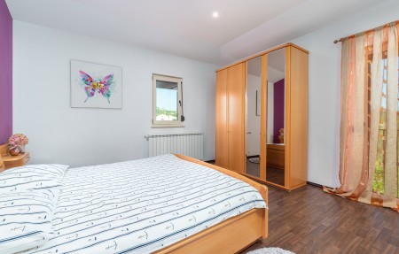 Kuća za 8 osoba: ca. 200 m², raspoređena na dvije etaže. U prizemlju se nalazi prostrani dnevni boravak s blagovaonicom, klima uređajem i direktnim izlazom na terasu, kao i potpuno opremljena kuhinja s dodatnim izlazom na terasu. Ova etaža također uključuje tri spavaće sobe – dvije su opremljene bračnim krevetom, klima uređajem i TV-om, dok treća spavaća soba ima bračni krevet i klima uređaj. Na raspolaganju su i kupaonica (tuš/kada/WC), kao i dodatni odvojeni WC. Na prvom katu nalazi se jedna spavaća soba s bračnim krevetom, klima uređajem, TV-om i izlazom na balkon, kao i kupaonica (tuš/WC).