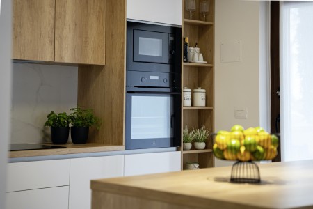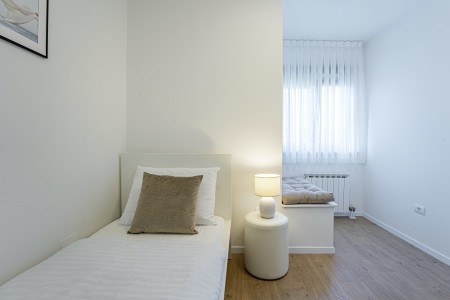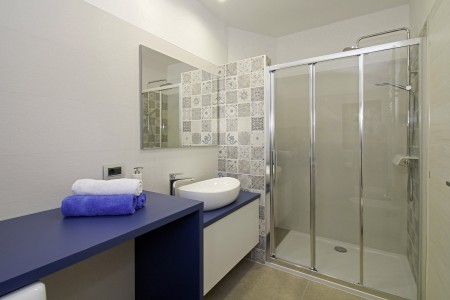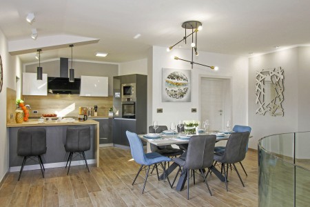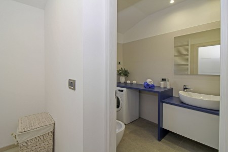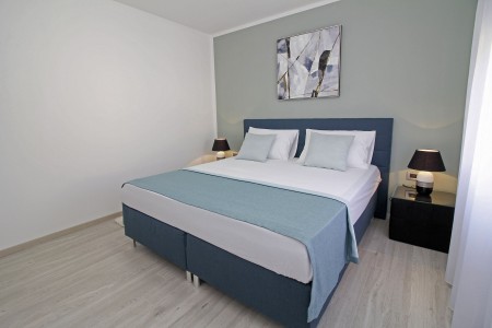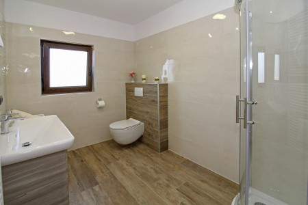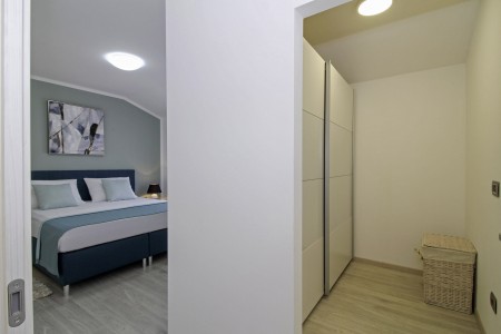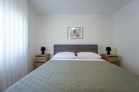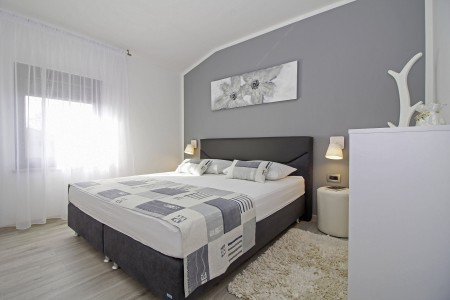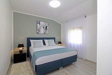 Kuća za 10 osoba: Kuća površine ca. 290 m² podijeljena na dva kata. U prizemlju dvije dvokrevetne sobe, jedna jednokrevetna soba, kuhinja s blagovaonom, dnevni boravak, dvije kupaone (tuš/WC), odvojeni WC. Klima u dnevnom boravku i u kuhinji. Na prvom katu je klimatizirani dnevni boravak, kuhinja i blagovaona dvije dvokrevetne sobe, jedna jednokrevetna soba, dvije kupaone (tuš/WC) i natkrivena terasa (ca. 12 m²). Osim toga, dvije velike terase i roštilj u prizemlju.