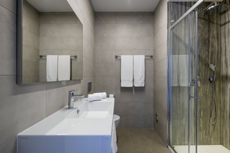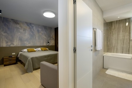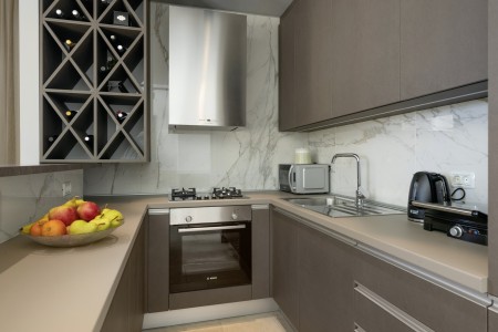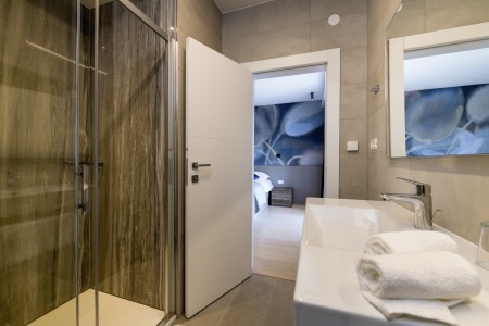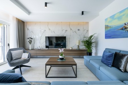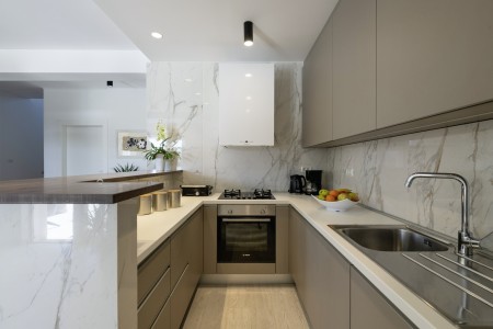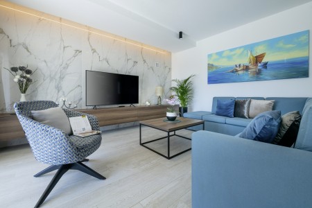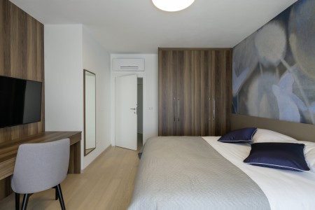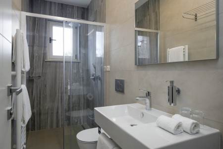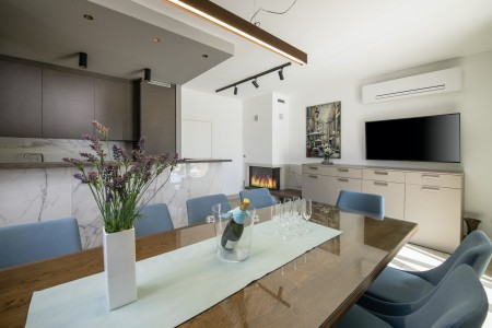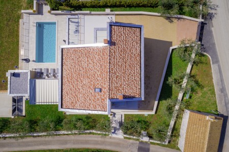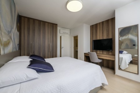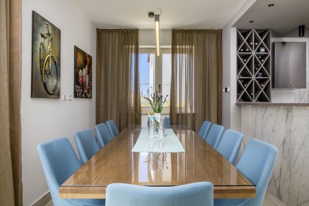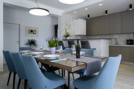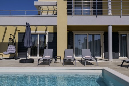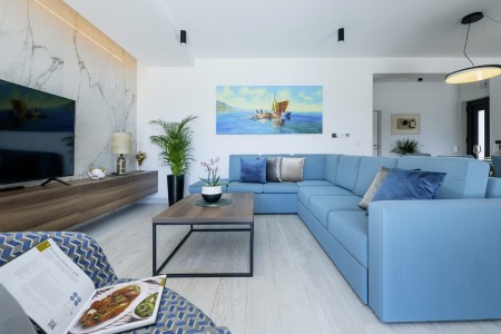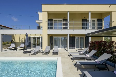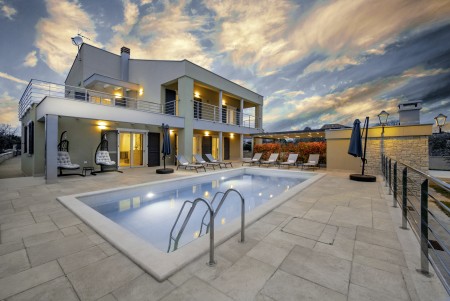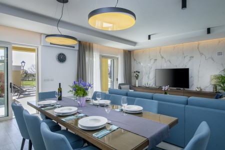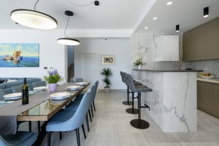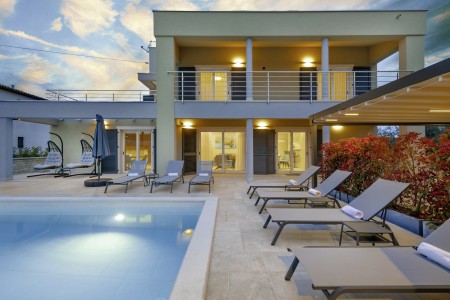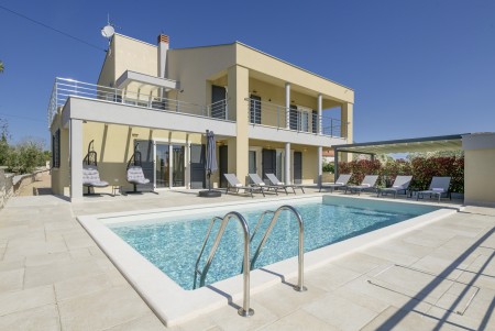 Kuća za 8-9 osoba: ca. 230 m², na dvije etaže. U prizemlju se nalazi moderna, potpuno opremljena kuhinja s blagovaonskim stolom, kaminom, klima uređajem, TV-om i pogledom na bazen. Nadalje, prizemlje nudi svijetli dnevni boravak s udobnom garniturom na razvlačenje (160 x 200 cm), klima uređajem, blagovaonskim stolom i drugom potpuno opremljenom kuhinjom. Osim toga, tu je i spavaća soba s bračnim krevetom te kupaonica (tuš/WC). Na prvome katu nalaze se tri udobne spavaće sobe s bračnim krevetima, dvije kupaonice (tuš/WC), te još jedna dodatna kupaonica (kada/WC). Svaka spavaća soba ima vlastiti TV i klima uređaj. Dvije spavaće sobe dijele balkon s pogledom na prirodu i more u daljini, dok treća spavaća soba ima vlastiti balkon. Osim toga, na prvom katu se nalazi i praonica s perilicom i sušilicom rublja.