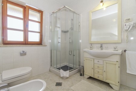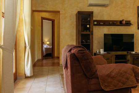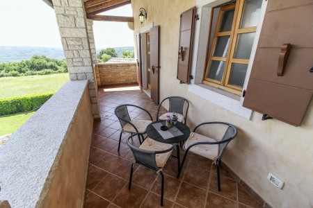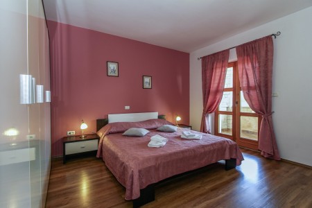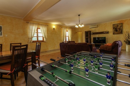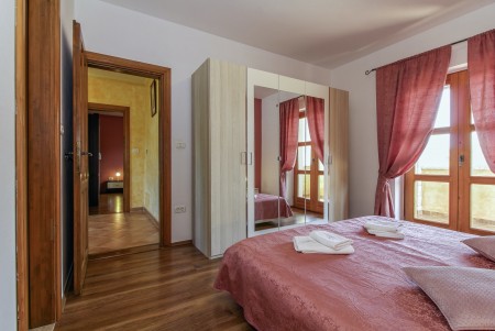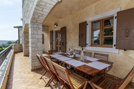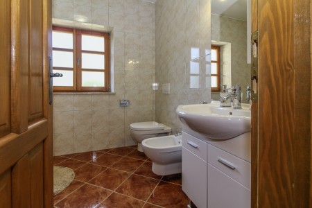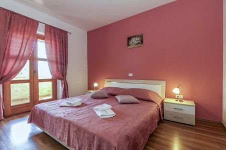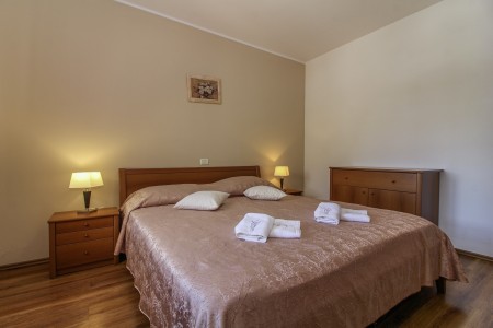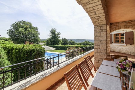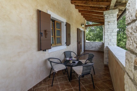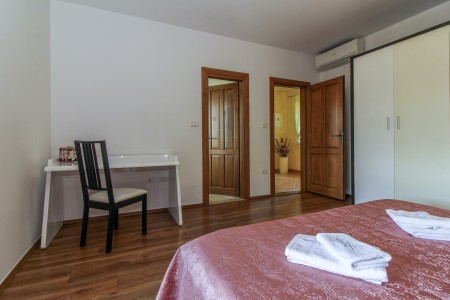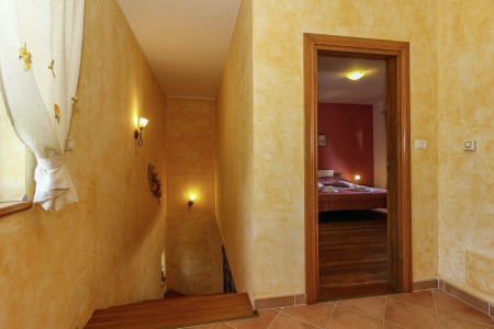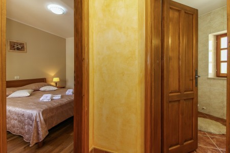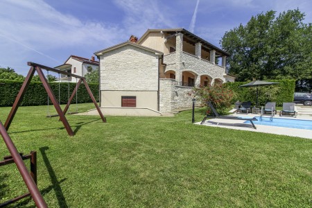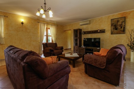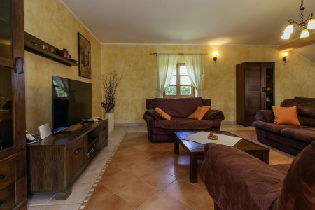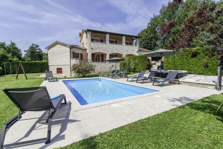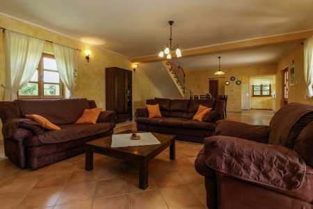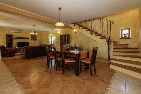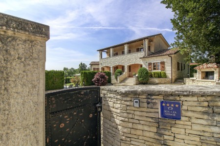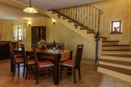 Kuća za 6-8 osoba: ca. 158 m², na dvije etaže. U prizemlju se nalazi udoban dnevni boravak i blagovaonica s klima uređajem i kaučem na razvlačenje (160 x 180 cm) te izlaz na natkrivenu terasu, potpuno opremljena kuhinja, spavaća soba s klima uređajem i bračnim krevetom, kupaonica (kada/WC), te još jedna kupaonica (tuš/WC). Na prvom katu nalaze se dvije spavaće sobe s bračnim krevetima i dvije kupaonice (tuš/WC). Obje spavaće sobe opremljene su klima uređajem te imaju zajedničku terasu s pogledom na bazen i okolnu prirodu.
