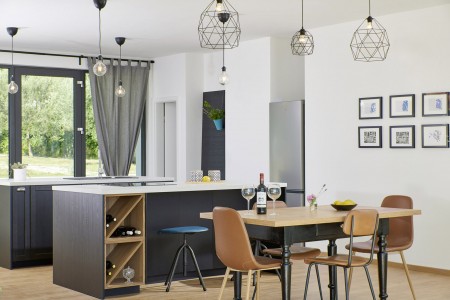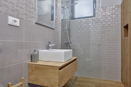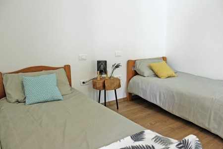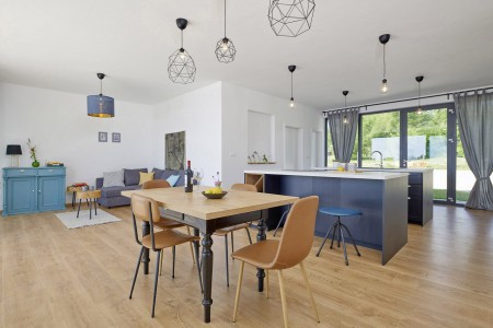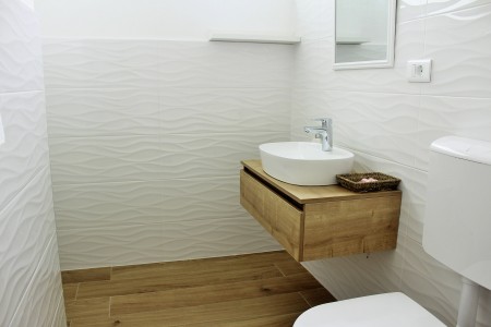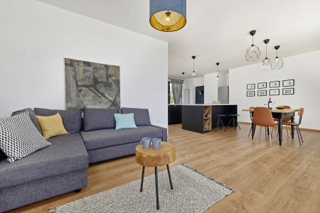 Kuća za 4 osobe: Prizemnica površine ca. 90 m². Dnevni boravak s blagovaonom i kompletno opremljenom kuhinjom i modernim kuhinjskim otokom, klima, te izlaz na natkrivenu terasu na bazenu. Jedna spavaća soba s bračnim krevetom, klimom i kupaonom (tuš/WC) te jedna spavaća soba s dva odvojena kreveta za po jednu osobu i kupaona (kada/WC).