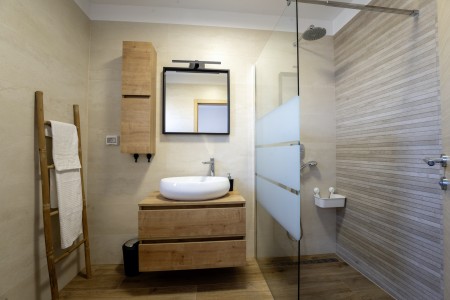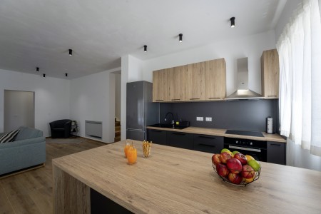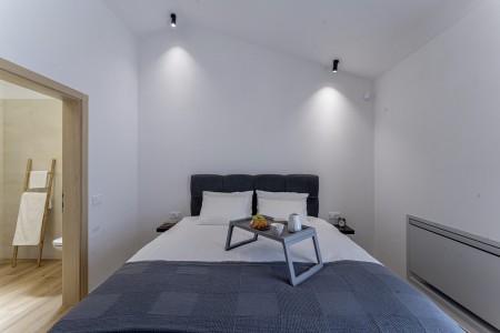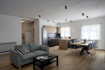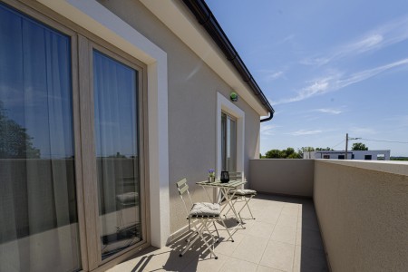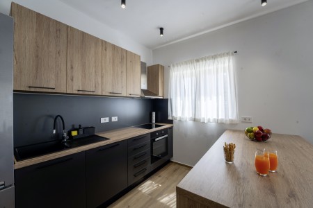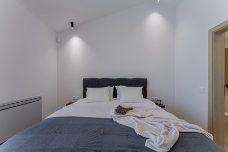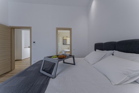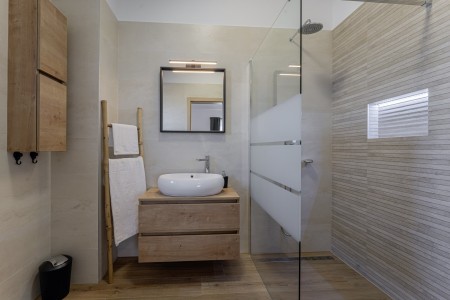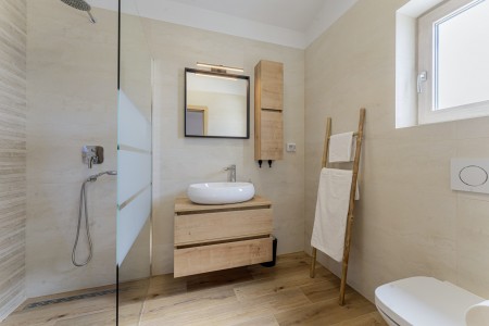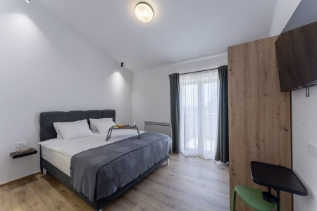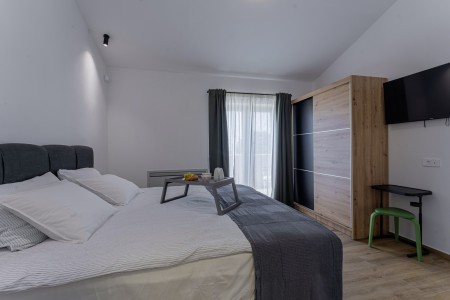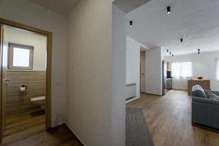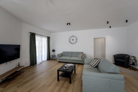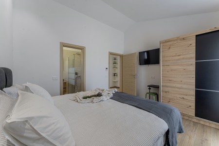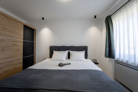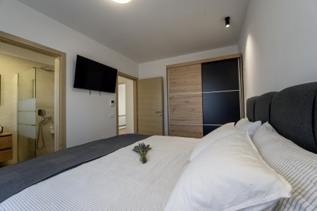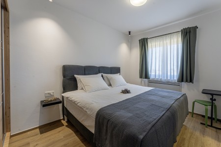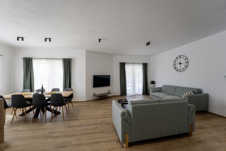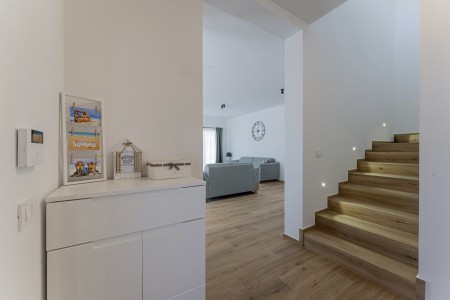 Kuća za 6-7 osoba: ca. 193 m², na dvije etaže, moderno i udobno uređena. U prizemlju se nalazi veliki open-space dnevni boravak s klima uređajem, kaučem na razvlačenje (125 x 180 cm) za jednu osobu, blagovaonicom i potpuno opremljenom kuhinjom s izlazom na natkrivenu terasu. Također, tu je i spavaća soba s klima uređajem, TV-om, bračnim krevetom i vlastitom kupaonicom (tuš/WC), te odvojeni WC. Na prvom katu nalaze se dvije udobne spavaće sobe sa zajedničkim balkonom s pogledom na more u daljini. Obje spavaće sobe opremljene su klima uređajem i TV-om te svaka ima vlastitu kupaonicu (tuš/WC).