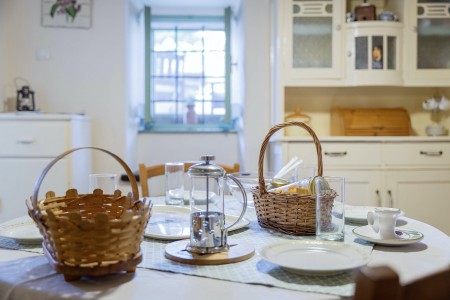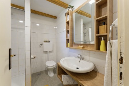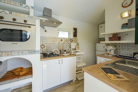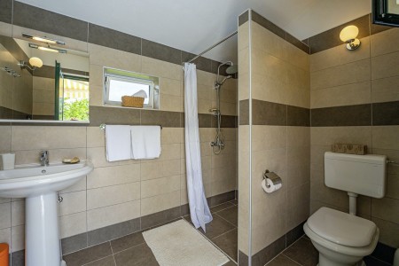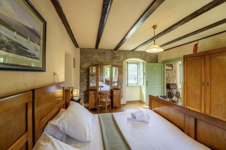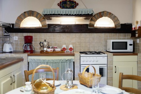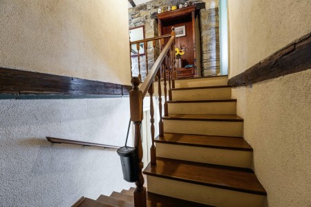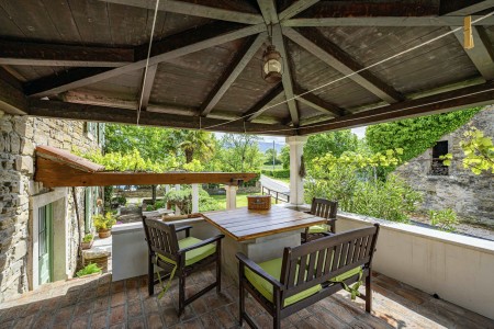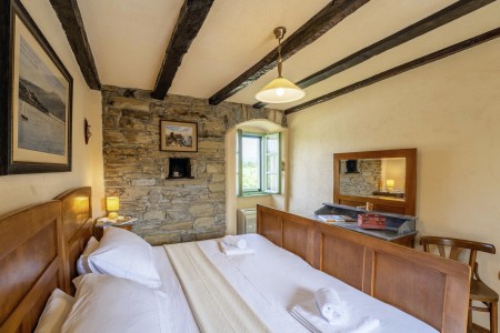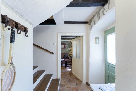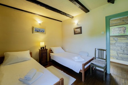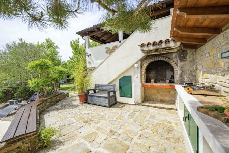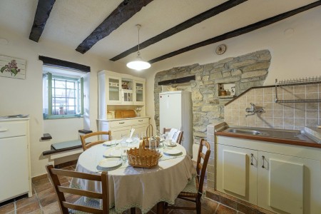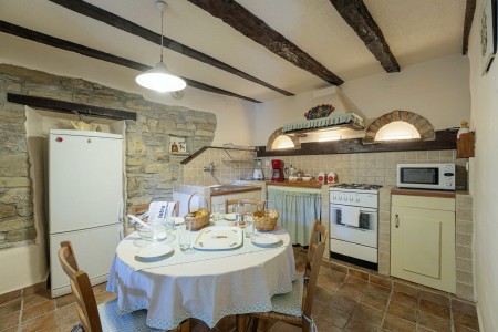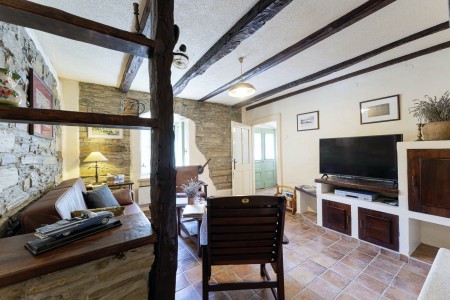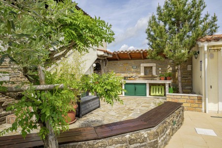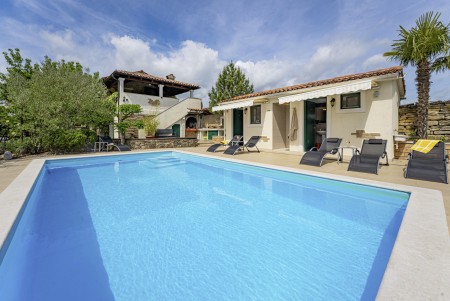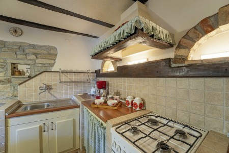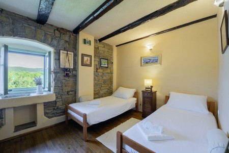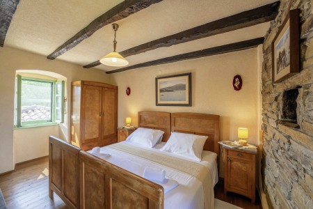 Kuća za 6 osoba: ca. 100 m², na dvije etaže. U prizemlju se nalaze kuhinja s blagovaonicom, dnevni boravak s kaminom te kupaonica (tuš/WC). Još jedna kupaonica (tuš/WC), kao i dodatna potpuno opremljena kuhinja (uključujući perilicu posuđa), nalaze se u kućici uz bazen. Prvi kat nudi spavaću sobu s bračnim krevetom i klima uređajem, spavaću sobu s dva odvojena kreveta za po jednu osobu i TV-om, te spavaću sobu s bračnim krevetom, klima uređajem i izlazom na natkrivenu terasu (ca. 20 m²) sa sjedećom garniturom, Smart TV-om i prekrasnim pogledom na Učku. S natkrivene terase vanjskim stepenicama dolazi se u vrt površine 500 m² koji je ograđen suhozidom.