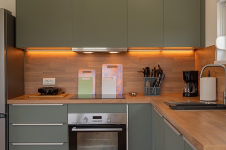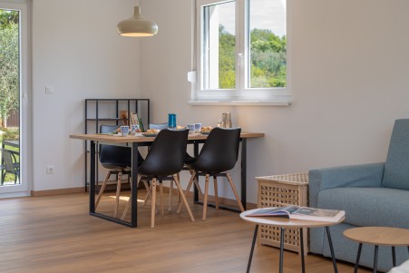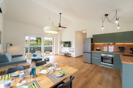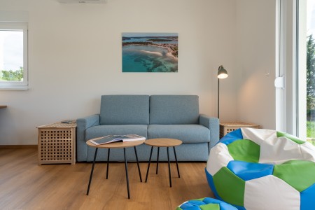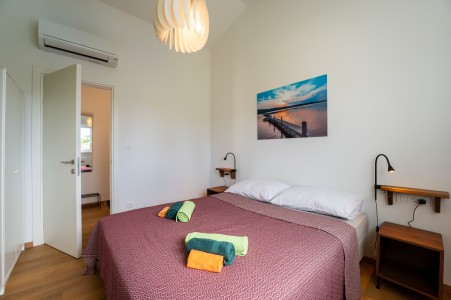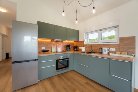 Kuća za 2-4 osobe: ca. 60 m², prizemnica. U većem prostoru nalazi se potpuno opremljena kuhinja s blagovaonicom i dnevnim boravkom s kaučem na razvlačenje za dvije osobe (140 x 200 cm), klima-uređajem i izlazom na terasu. Osim toga, tu je spavaća soba s bračnim krevetom, TV-om i klima-uređajem te kupaonica (tuš/WC).