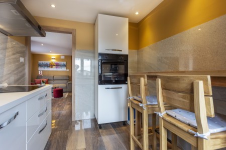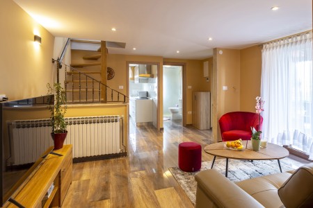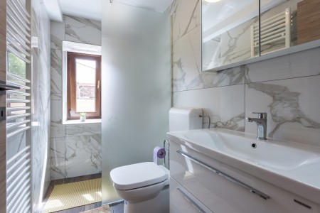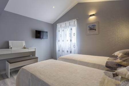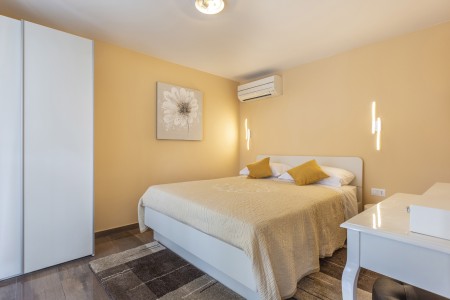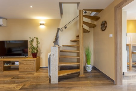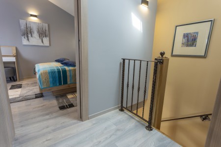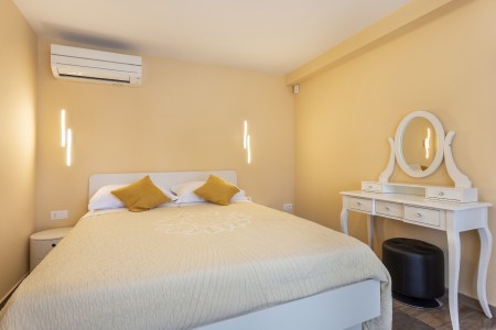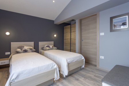 Kuća za 6-8 osoba: ca. 125 m², na tri etaže. U prizemlju spavaća soba sa bračnim krevetom, klimom i televizijom, kuhinja sa dnevnim boravkom, klimom i kaučem koji se može razvući u pomoćni krevet (140 x 200 cm). Osim toga, jedna kupaona (tuš/WC). Na prvom katu na koji se dolazi vanjskim stepenicama, nalazi se još jedna kompletno opremljena kuhinja, blagovaona sa kaminom, udobna dnevna soba sa klimom i kaučem koji se može razvući u pomoćni krevet (140 x 200 cm), kupaona (tuš/WC). Potkrovlje se sastoji od dvije komforne spavaće sobe, jedna sa bračnim krevetom a druga sa dva odvojena kreveta koji se po želji mogu spojiti. Obje sobe imaju klimu u televiziju.