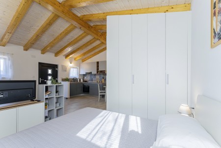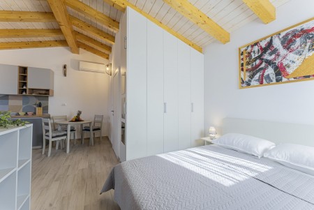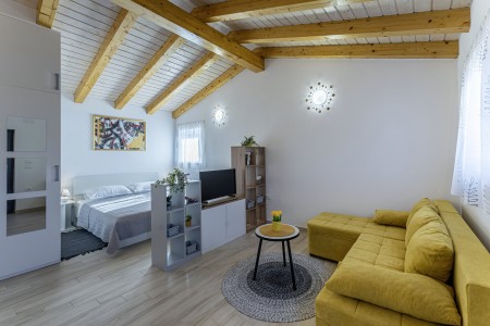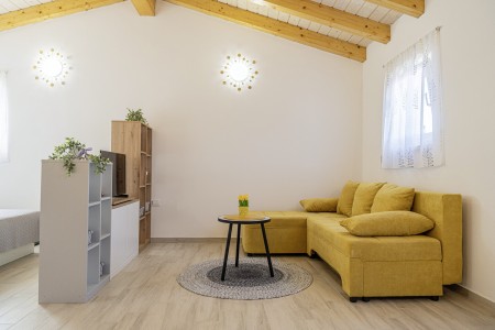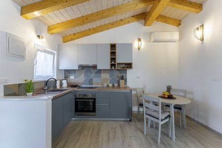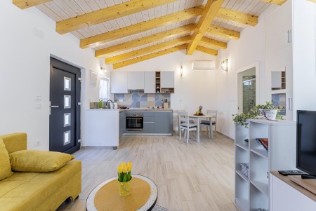 Kuća za 2-3 osobe: ca. 35 m², u prizemlju. Sastoji se od dnevno-spavaće sobe s potpuno opremljenom kuhinjom, blagovaonicom, klima uređajem, kaučem na razvlačenje (80 x 180 cm) za dijete do 14,99 godina i bračnim krevetom. Kupaonica (tuš/WC) s perilicom rublja.