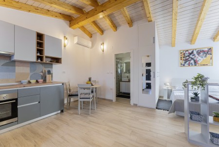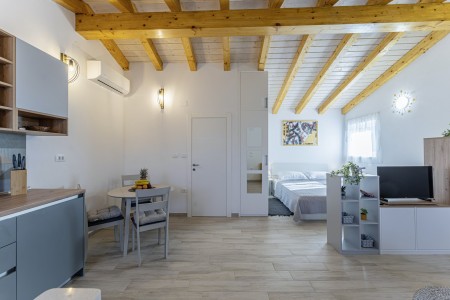 Ova novoizgrađena, moderno uređena kućica smještena je u Pješčanoj Uvali, mirnom predgrađu Pule, na samo 600 m od najbliže plaže i približno 4 km od povijesne gradske jezgre. Pula svojim posjetiteljima nudi brojne znamenitosti, restorane, mogućnosti za zabavu i kupovinu. Najpoznatiji simbol grada je impozantna Arena, rimski amfiteatar koji se može razgledati, a ljeti služi i kao jedinstvena pozornica na otvorenom za koncerte i filmske projekcije. U blizini se nalazi ribarsko mjesto Fažana, odakle polaze brodovi prema Nacionalnom parku Brijuni, destinaciji koju vrijedi posjetiti. Restorani i trgovine nalaze se na pješačkoj udaljenosti.