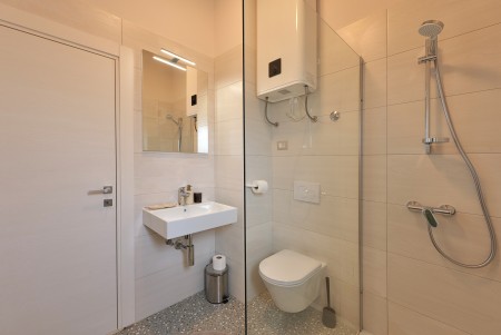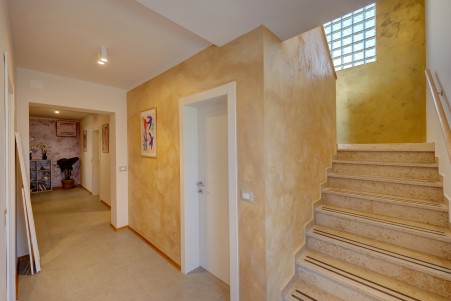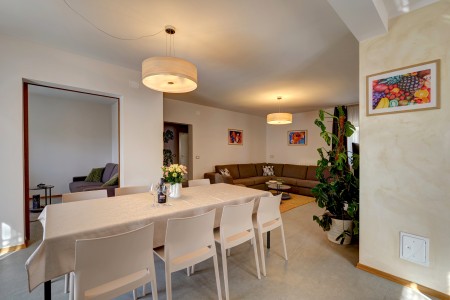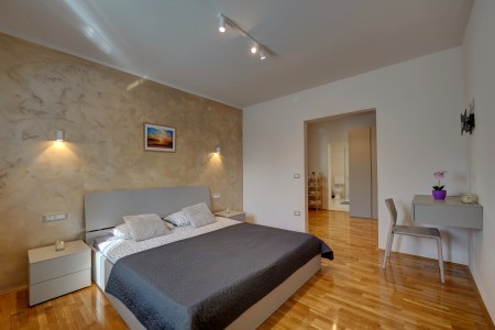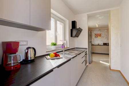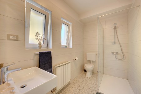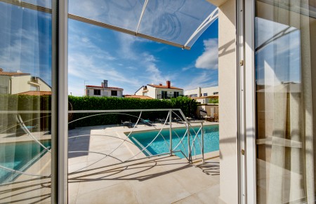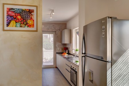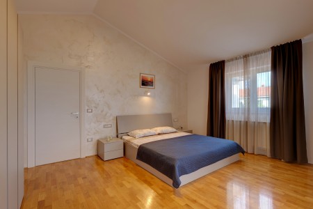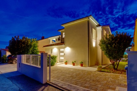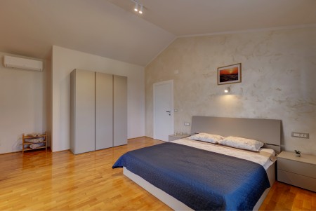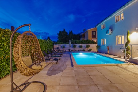 Kuća za 8 osoba: ca. 250 m², na dvije etaže, moderno i udobno uređena. U prizemlju se nalazi potpuno opremljena kuhinja, dnevni boravak/blagovaonica s klima uređajem i kaučem, soba za igru s kaučem i PlayStation konzolom, jedna spavaća soba s bračnim krevetom i klima uređajem, kupaonica (tuš/WC) te zaseban WC. Iz dnevnog boravka izlazi se na terasu uz bazen. Na katu se nalaze dvije spavaće sobe s bračnim krevetima i klima uređajem, jedna spavaća soba s dva odvojena kreveta za po jednu osobu i klima uređajem, te tri kupaonice (tuš/WC). Jedna od spavaćih soba ima vlastiti balkon.