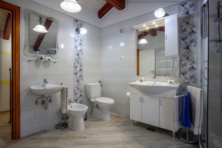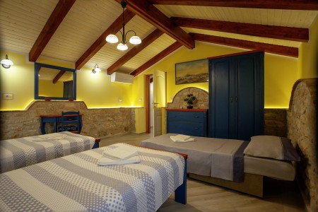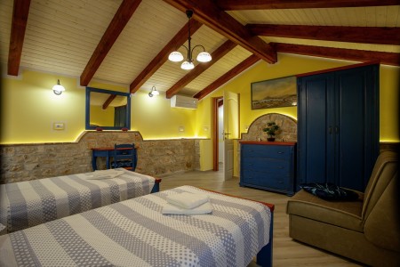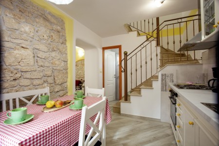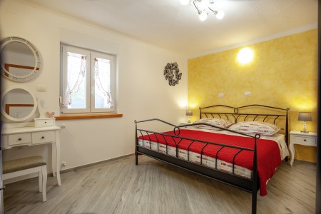 Kuća za 4-5 osoba: ca. 100 m², na dvije etaže. U prizemlju se nalazi spavaća soba s bračnim krevetom i klimom, kupaonica (tuš/WC), ugodan dnevni boravak s klimom, potpuno opremljena kuhinja s blagovaonicom, terasa i zaseban WC. Prvi kat nudi klimatiziranu spavaću sobu s dva odvojena kreveta za po jednu osobu i kauč na razvlačenje (80 x 190 cm) te kupaonicu (tuš/WC).