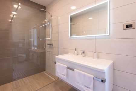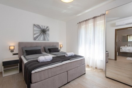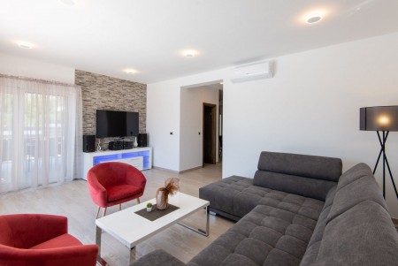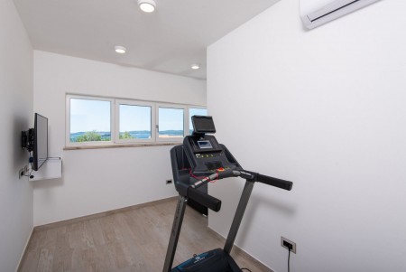 Kuća za 8 osoba: ca. 200 m², na dvije etaže, moderno uređena. U prizemlju se nalazi potpuno opremljena kuhinja s blagovaonicom i klima uređajem, udoban dnevni boravak s klimom i izlazom na veliku terasu s pogledom na bazen. Nadalje, spavaća soba s bračnim krevetom, klima uređajem, TV-om i kupaonicom (tuš/WC), kao i odvojeni WC. Na prvom katu nalaze se tri udobne spavaće sobe s bračnim krevetima, a svaka je opremljena klima uređajem i TV-om. Jedna od spavaćih soba ima prostrani balkon s pogledom na more, dok druga ima jedan manji balkon. Na ovom katu nalaze se i jedna kupaonica (tuš/WC) te još dvije kupaonice (kada/WC). Osim toga, gostima je na raspolaganju klimatizirana prostorija s fitness spravama, TV-om i PlayStation-om.