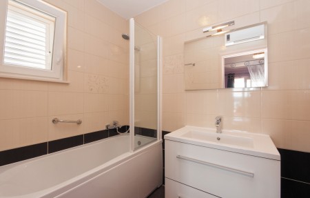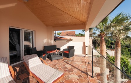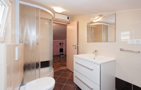 Kuća za 8 osoba: ca. 130 m², na tri etaže. U prizemlju se nalazi potpuno opremljena kuhinja s blagovaonicom, klima uređaj i izlaz na natkrivenu terasu s pogledom na more, dnevni boravak s kaučem, kaminom, stolom za četiri osobe, klima uređajem i WC. Na prvom katu nalaze se dvije spavaće sobe. Prva spavaća soba opremljena je bračnim krevetom, ormarom, izlazom na terasu s pogledom na more te kupaonicom (kada/WC). Druga spavaća soba također ima bračni krevet, ormar i kupaonicu (kada/WC). Na drugom katu nalazi se spavaća soba s bračnim krevetom, ormarom, izlazom na terasu s pogledom na more te kupaonicom (kada/WC). Osim toga, tu je i četvrta spavaća soba s rasklopivim kaučem (160 x 200 cm), kupaonica (tuš/WC), i sauna. Sve spavaće sobe opremljene su SAT-TV-om i klima uređajem.