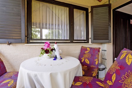 Kuća za 6 osoba: ca. 65 m² u prizemlju. Tri dvokrevetne sobe, kuhinja s blagovaonom, jedna kupaona (tuš/WC), terasa sa garniturom za sjedenje.