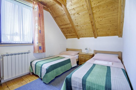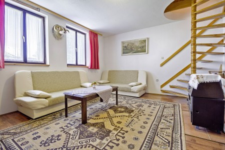 Kuća za 5 osoba: ca. 90 m², podjeljena na dvije etaže. U prizemlju se nalazi kuhinja s blagovaonicom, dnevni boravak sa kaminom i kupaona (kada/WC). Strme spiralne stepenice vode na gornji kat (potkrovlje), koji se sastoji od jedne dvokrevetne spavaće sobe, jedne trokrevetne spavaće sobe i jedne kupaone (tuš/WC). Klima uređaj nalazi se između dvije etaže. Tako da ovisno o usmjerenju hladi ili potkrovlje ili dnevni boravak. Kuća je opremljena centralnim grijanjem.