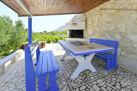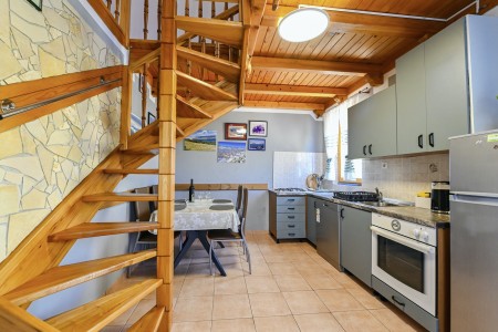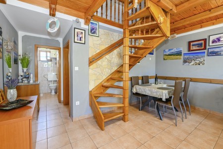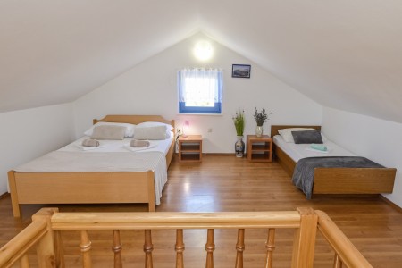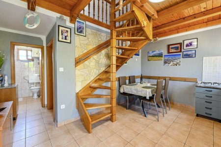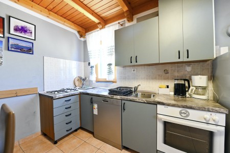 Kuća za 5 osoba: ca. 60 m², na dvije etaže, jednostavno uređena. U prizemlju se nalazi kuhinja s blagovaonicom i TV-om, jedna spavaća soba s bračnim krevetom te kupaonica (tuš/WC). Iz kuhinje strme stepenice vode na kat, gdje se nalaze bračni krevet i jedan krevet za jednu osobu. Klima uređaj smješten je iznad stepenica. Vani se nalazi natkrivena terasa s kaminom, stolom i stolicama.