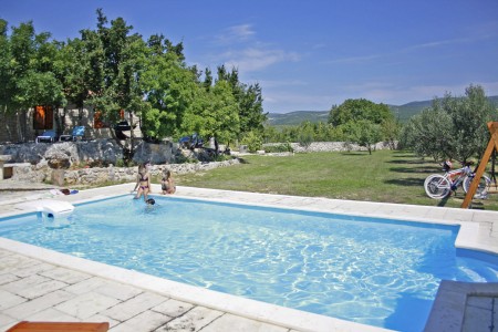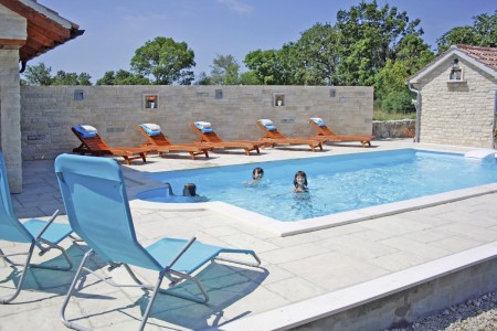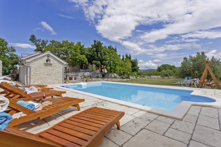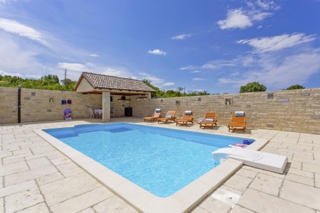 Ova udobno uređena kamena kuća nalazi se na mirnoj lokaciji u malom dalmatinskom selu Popovići. Okružena je s 2000 m² zemljišta, vlastitim vinogradom i održavanim travnjacima te time pruža odlične uvjete za opuštajući odmor u privatnoj atmosferi. Pored potpuno opremljene ljetne kuhinje s velikim kaminom za roštilj i velikom blagovaonom na otvorenom, tu je i privatni grijani bazen (7 x 4 m) s terasom za sunčanje i ležaljkama. Kuća ima i saunu za 4 osobe. Za naše male goste više je nego dovoljno prostora za igru, a tu je i jedan trampolin. Trgovine, restorani i plaže udaljeni su samo par minuta vožnje autom. Najljepši grad u sjevernoj Dalmaciji, Zadar, udaljen je 45 km i svakako je vrijedan posjeta.